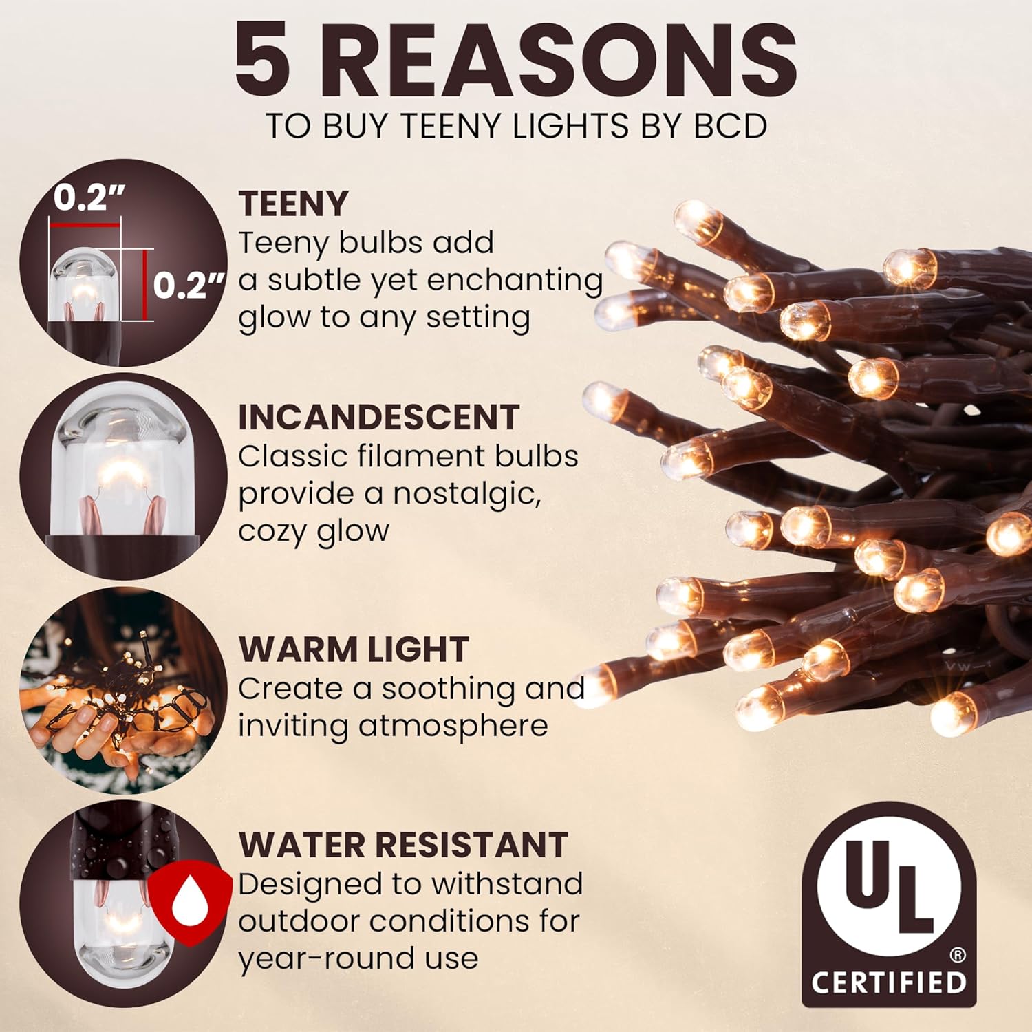 Teeny Lights 50Ct Brown - Warm Mini Bulbs with Brown Cord - Indoor/Outdoor Water-Resistant Farmhouse String Lights for Patio, Wedding, Home Decor, Rustic Christmas