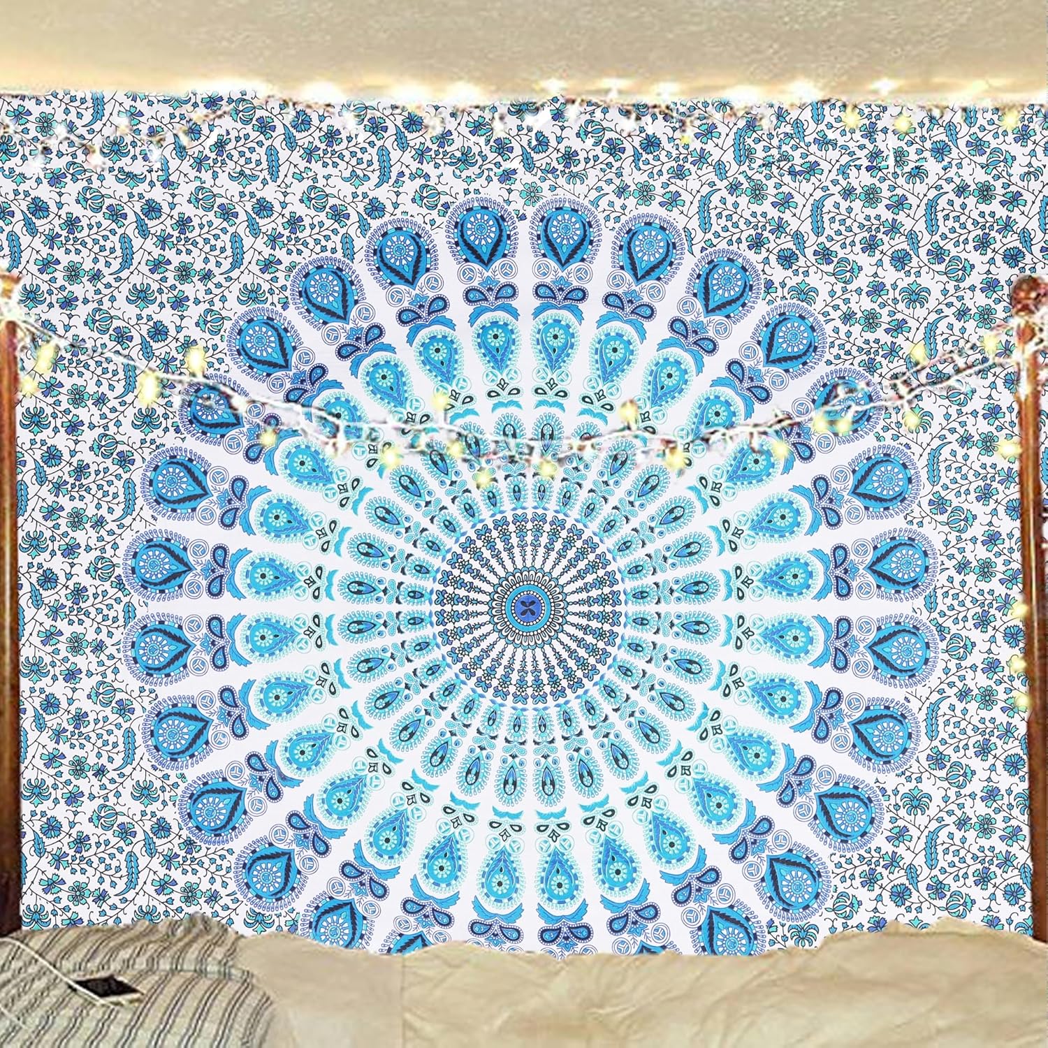 Bless International Handmade Indian hippie Bohemian Psychedelic Peacock Mandala Wall hanging College Dorm Beach Throws Table Cloth Bedding Tapestry (Peacock Sky Blue, Twin(54x72Inches)(140x185cms))