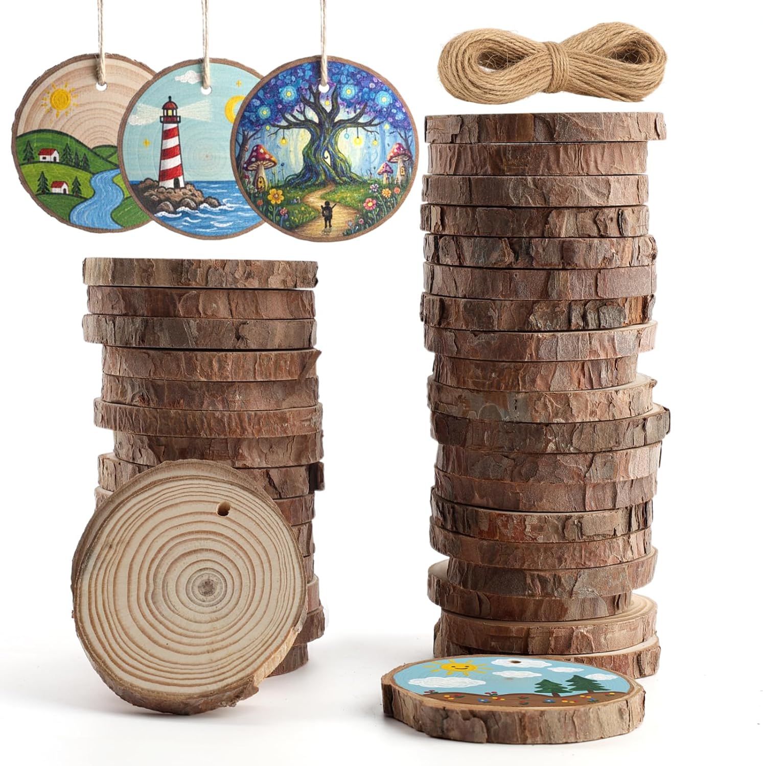 JOHOUSE 40Pcs Wood Slices, 2.9"-3.4" Unfinished Natural Wood Rounds for Crafts, Christmas Ornaments, Home Decor, Painting, Coasters, DIY Gifts, Party Wedding Decor, with Pre-drilled Hole
