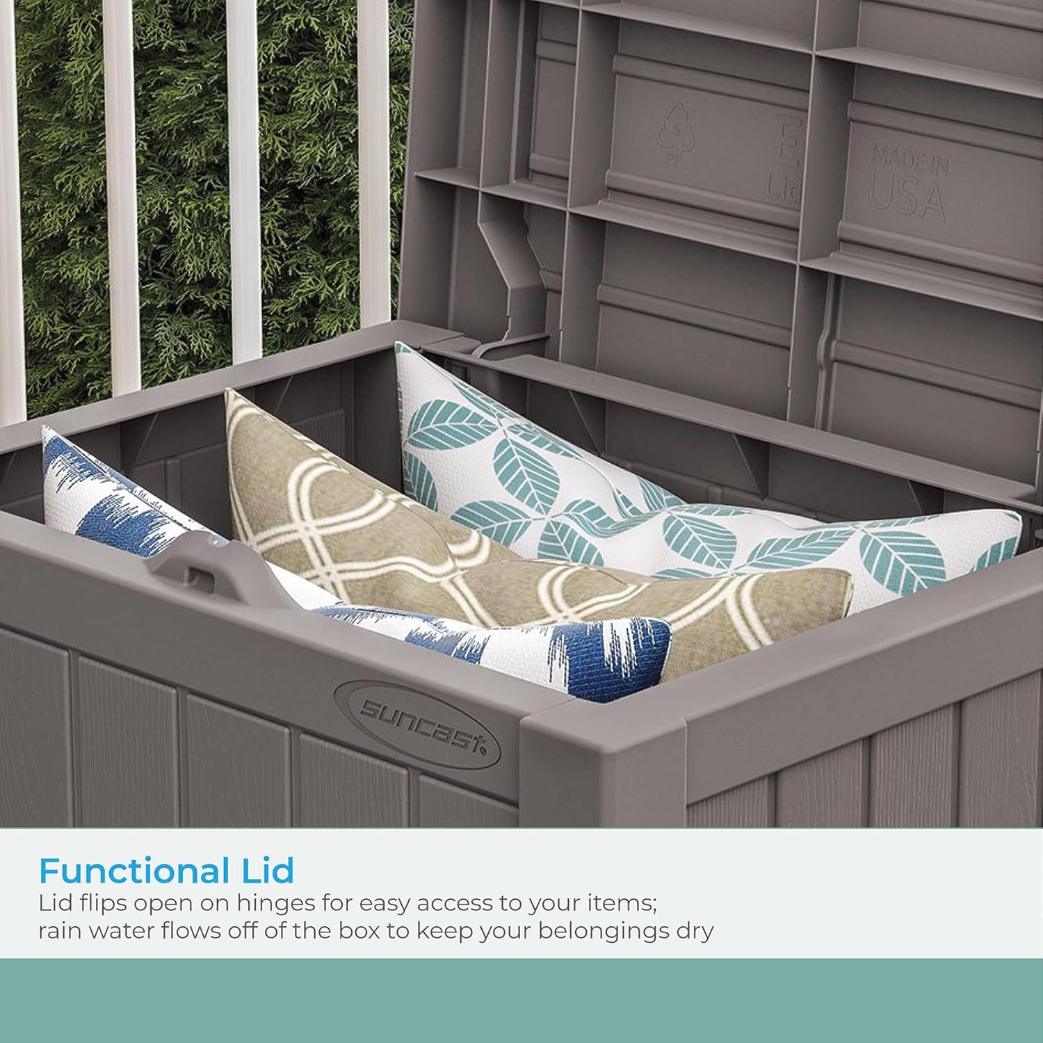 - FUNCTIONAL DESIGN: Lid flips open on hinges for easy access to your items. Rain water flows off of the box to keep your belongings dry and free from mildew and rust