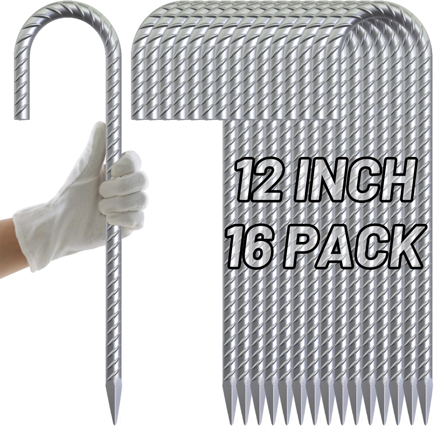 AAGUT 12 Inch Rebar Stakes J Hook 16 Pcs 3/8" Chain Link Fence Stakes Heavy Duty Galvanized Steel Tent Stakes Ground Anchors for Hard Firm Soil, Silver