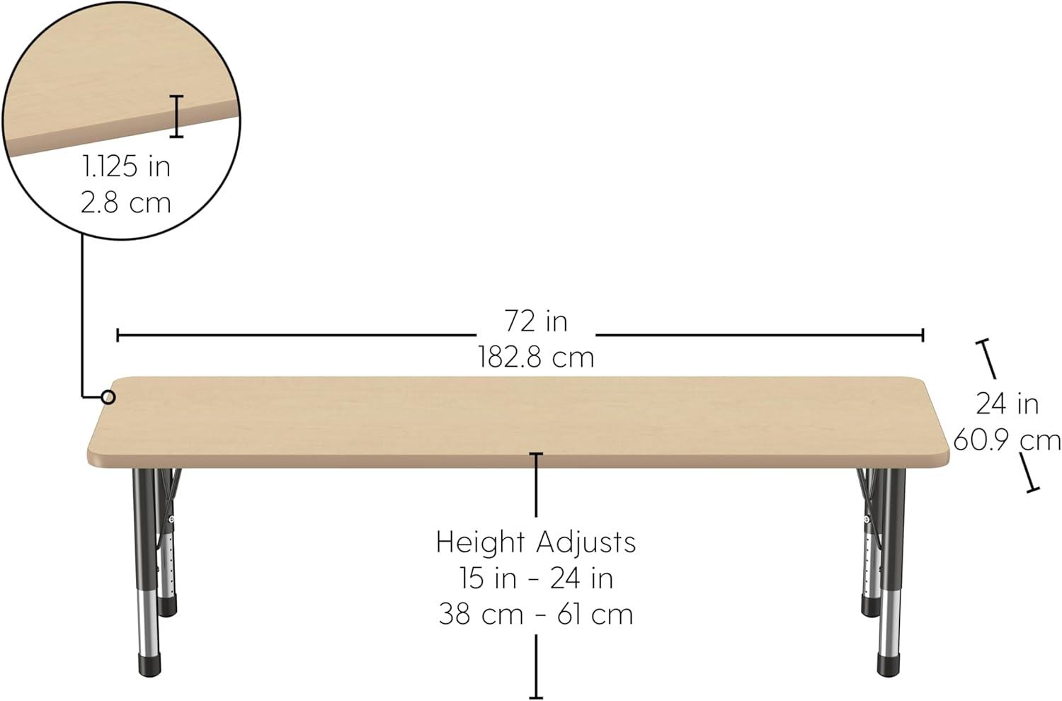FDP Rectangle Activity School and Classroom Kids Table (24 x 72 inch), Chunky Toddler Legs, Adjustable Table Height 15-24 inches - Maple Top and Maple Edge