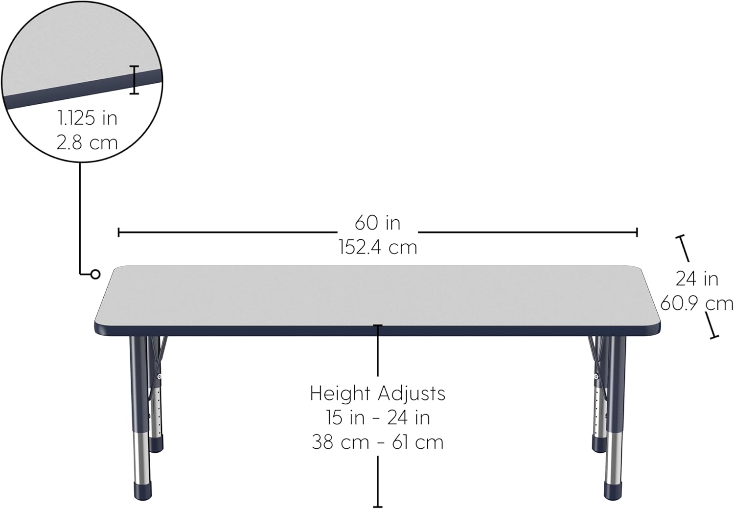 Factory Direct Partners FDP Rectangle Activity School and Classroom Kids Table (24 x 60 inch), Chunky Toddler Legs, Adjustable Height 15-24 inches - Gray Top and Navy Edge