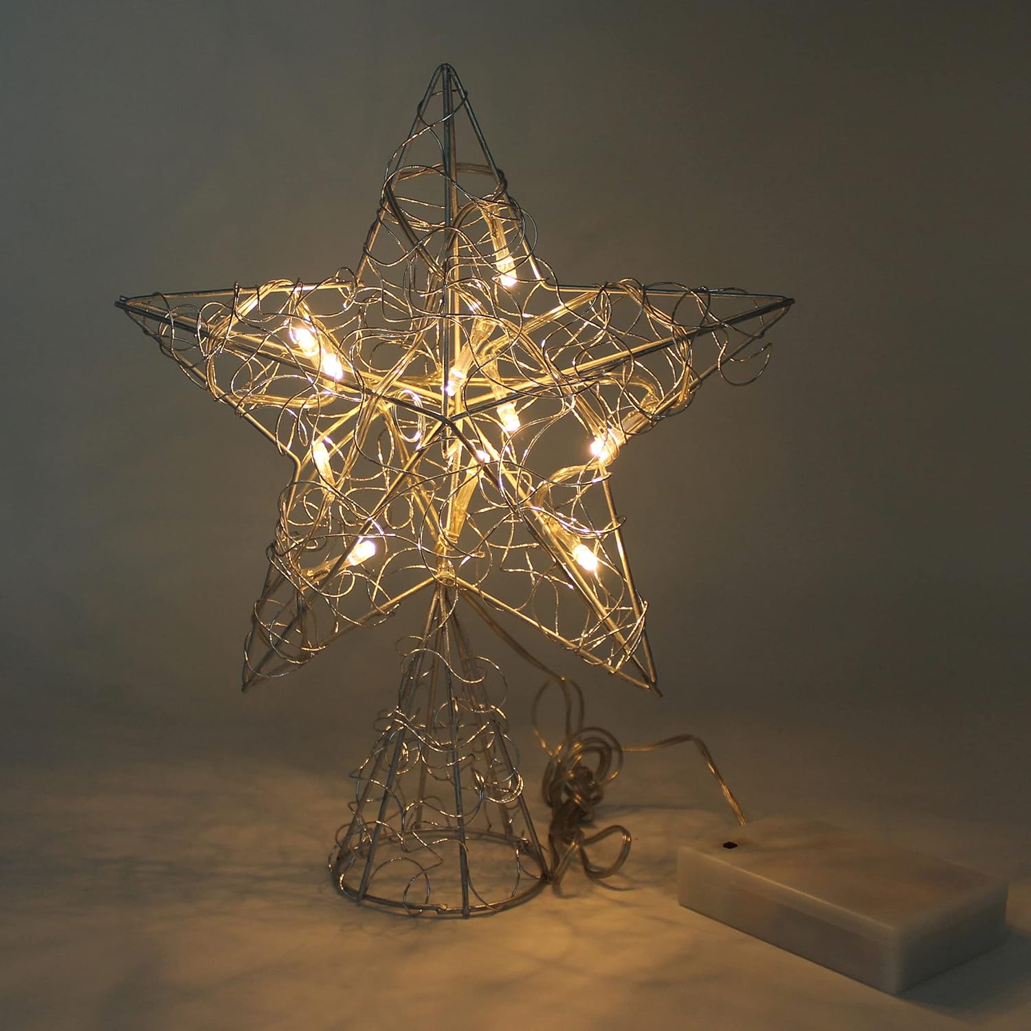 CVHOMEDECO. Silver Wire Twine Tree Top Star with Bright White LED Lights and Timer for Christmas Ornaments and Holiday Seasonal Décor, 8 x 10 Inch