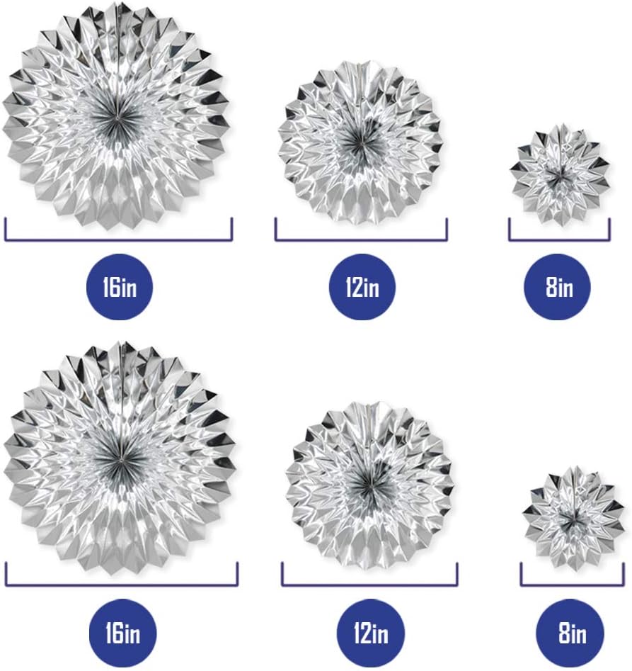 - 【MATERIAL & SIZE】Paper fan flowers are preferably thickened paper materials. Each silver paper fans set includes 6pcs, three size(Diameter: 8 inch*2/ 12 inch*2 / 16 inch*2)