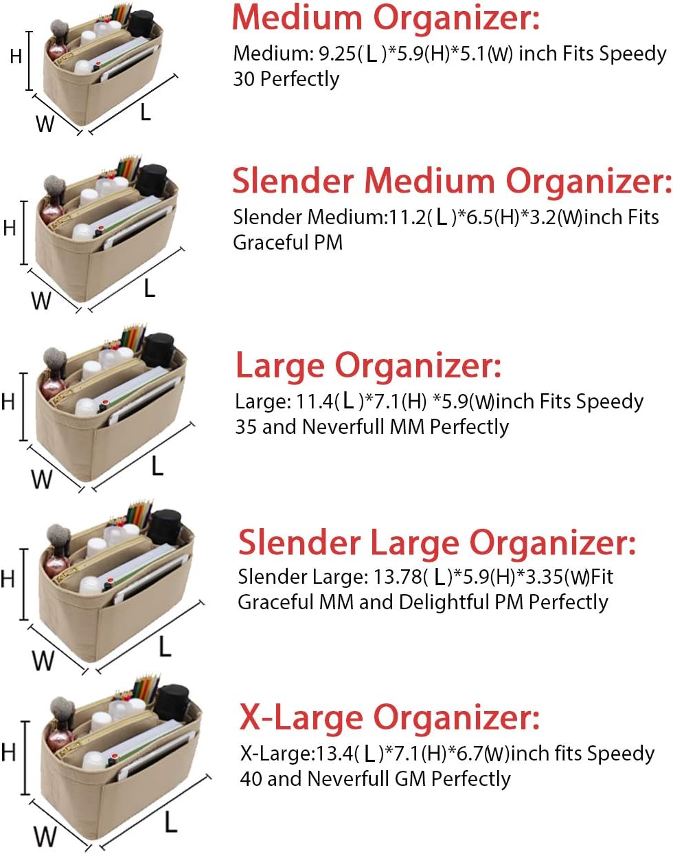 - SIZE OF BAG ORGANIZER: Medium: 9.25(L)*5.9(H)*5.1(W) inch Fits Speedy 30 Perfectly. Slender Medium: 11.2(L)*6.5(H)*3.2(W)inch Fits Graceful PM. Large: 11.4(L)*7.1(H) *5.9(W)inch Fits Speedy 35 and Neverfull MM Perfectly. Slender Large: 13.78(L)*5.9(H)*3.35(W)Fit Graceful MM and Delightful PM Perfectly. X-Large:13.4(L)*7.1(H)*6.7(W)inch fits Speedy 40 and Neverfull GM Perfectly. Portable and Compact Purse Perfectly For any Brand.L*H*W means (Length*Height*Width)