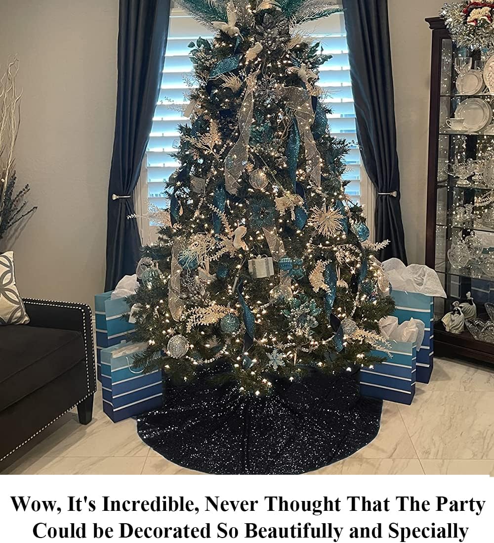 - Workmanship : glitter sequin tree skirt have been serged edges avoid falling sequins. Keep the tree skirt in the lamplight or sunlight, it sure to give you a big surprise.