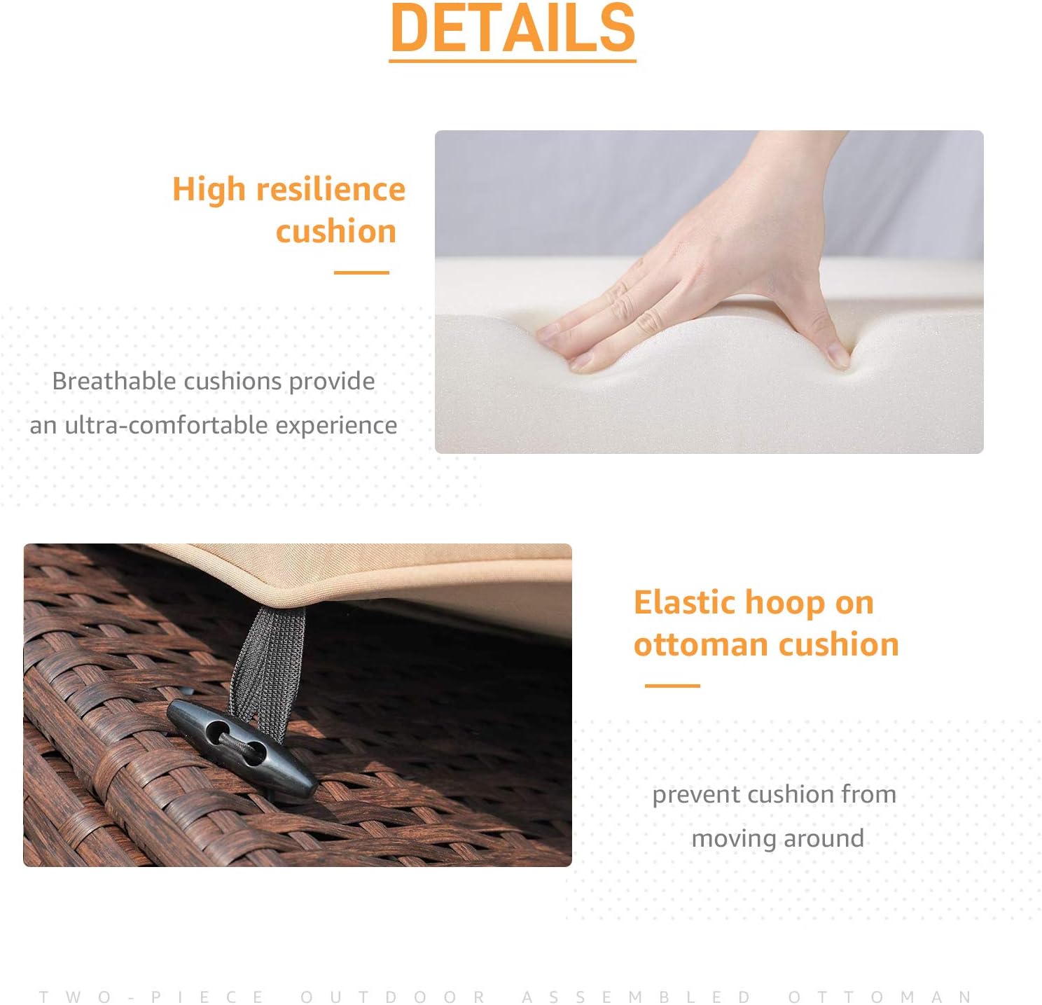 Patiorama 2 Pieces Assembled Outdoor Patio Ottoman, Indoor Outdoor All-Weather Dark Brown Wicker Rattan Outdoor Footstool Footrest Seat with Beige Cushions, No Assembly Required