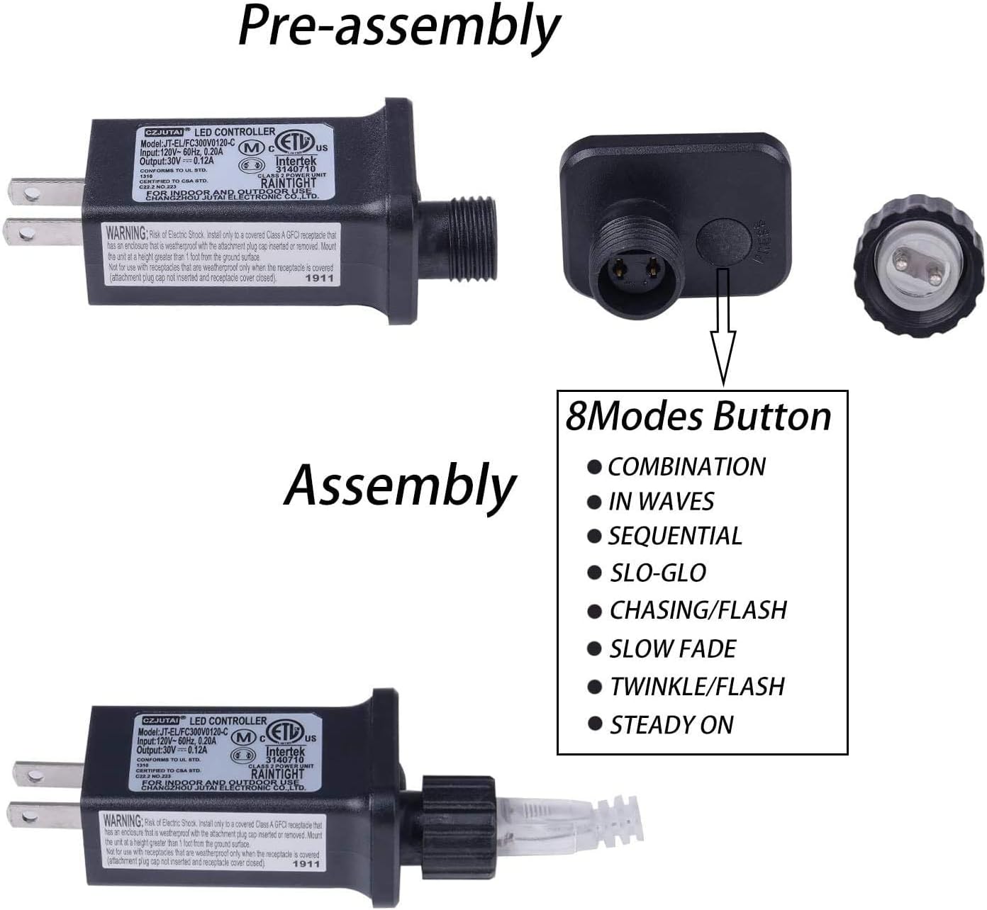 - 8 blinking modes: Combination, in waves, sequential, slogs, chasing/flash, slow fade, twinkle/flash, and steady on