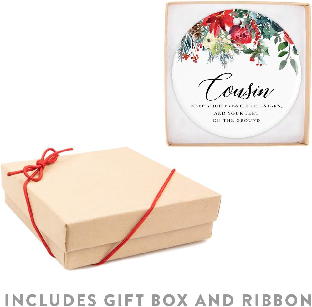 Andaz Press Round Ceramic Porcelain Christmas Tree Ornament Keepsake Gift for Cousins, Cousin Keep Your Eyes on The Stars, and Your Feet on The Ground, 1-Pack