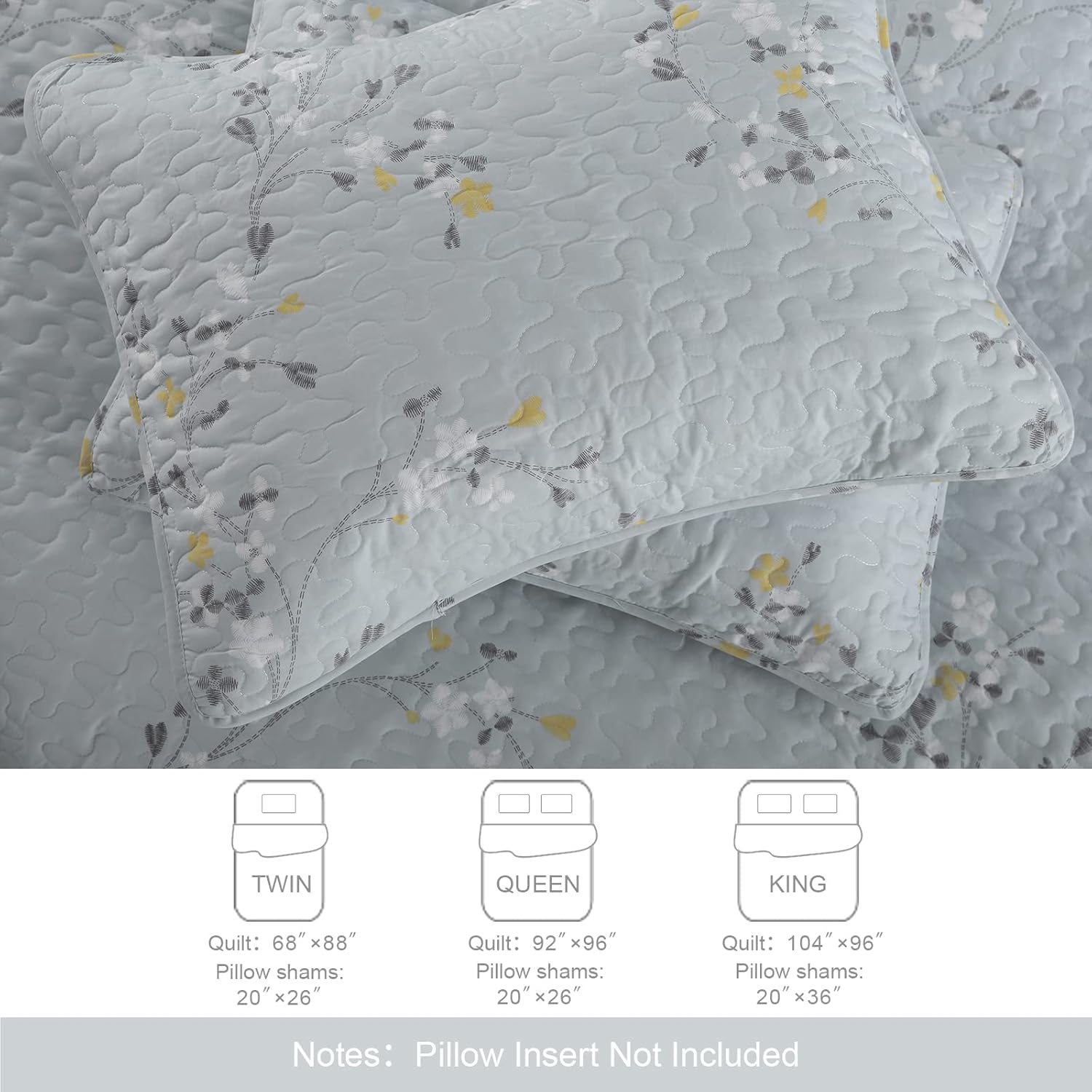 - What You Can Get: The king size quilt set comes with a king quilt (104"x 96") and two pillow shams (20"x 36"). Tips: If you want a bedspread or coverlet that drapes to the floor, please select a larger size. Because of random clipping, the pattern of each pillow sham may be a little different