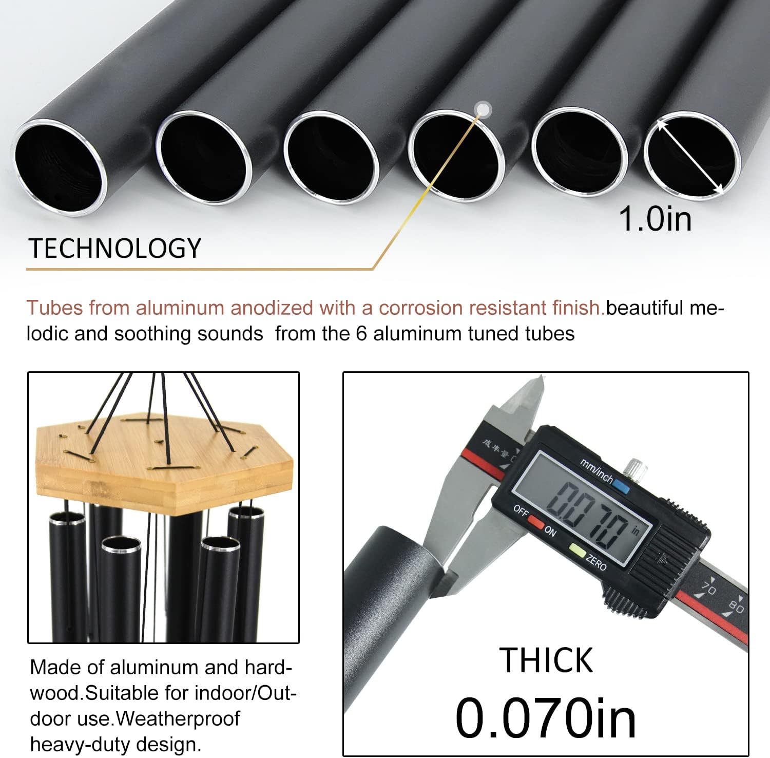 - Quality Materials- Heavy duty nylon cording, high density beech wood striker for a clear tone and resonances. Thick tubing wall creates a longer lasting deep tone. High-quality aluminum tubes create clear deep tone
