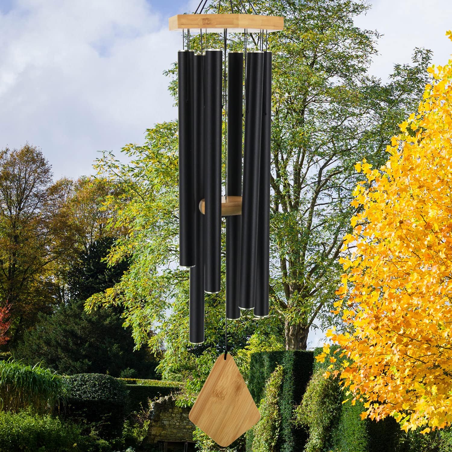 - Unique Wind Chimes Design-36-inch height from hanging hook to bottom wind catcher, the top beech wood offers a unique look. Secured with black nylon string, they hang from a strong S hook, EASILY TO HANG. 6 aluminum powder-coated tubes are hand-tuned; you can enjoy peaceful melodies that play as a whisper in the wind.