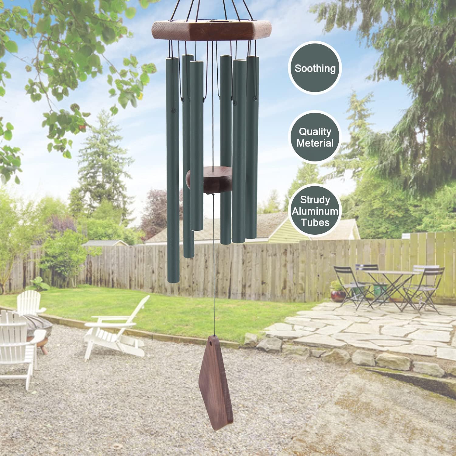 - Sing to You - The sound of this wind chime is adjusted just right, it will not make you feel noisy, nor too small to hear. Each tube has its own tone, 6 thicker aluminum tubes precisely tuned by master craftsmen to the Soothing Melodic Tone. Musical Chime sound is soft, deep and relaxing. When the wind blows gently, just enjoy the melody the chime brings.