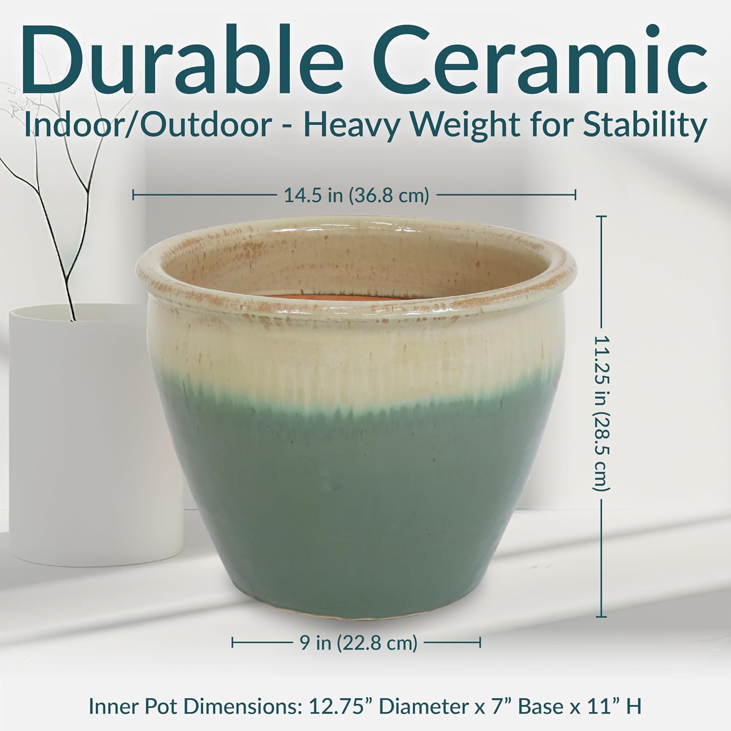 - DESIGNED FOR BEAUTY AND DURABILITY: This outdoor plant pot is crafted with a rich, hand-painted glazed finish that is kiln-fired for a classic, shining appearance. Subtle variations in color highlight the artisanal glazing process, making each piece truly unique. The durable ceramic construction offers natural UV and frost resistance, while its heavy weight adds stability to outdoor arrangements, keeping the planter upright in windy conditions.
