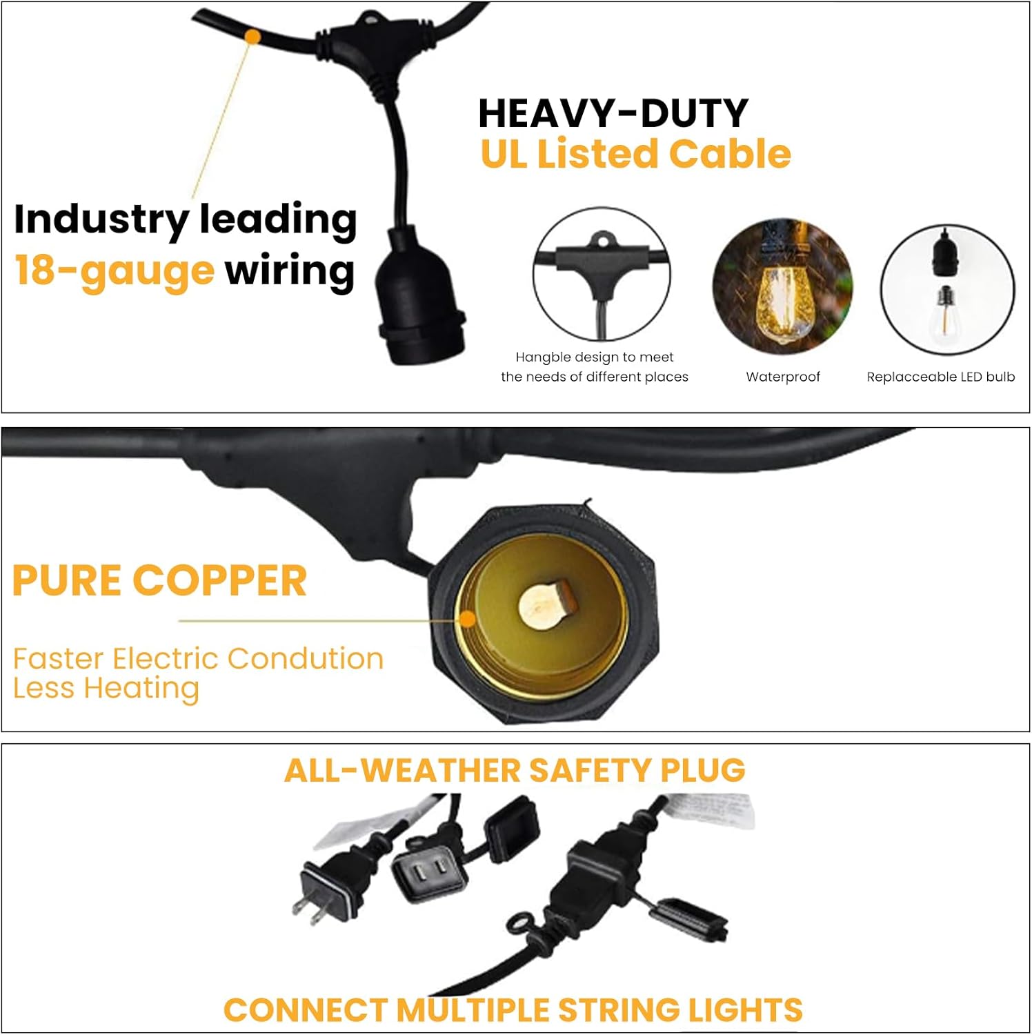 - Commercial Grade: ETL Certified with a high IP65 waterproof rating. With heavy-duty wire construction throughout the molded sockets, our outdoor patio string lights can withstand rain, sun, wind, snow, humidity—durable for year-round outdoor use.