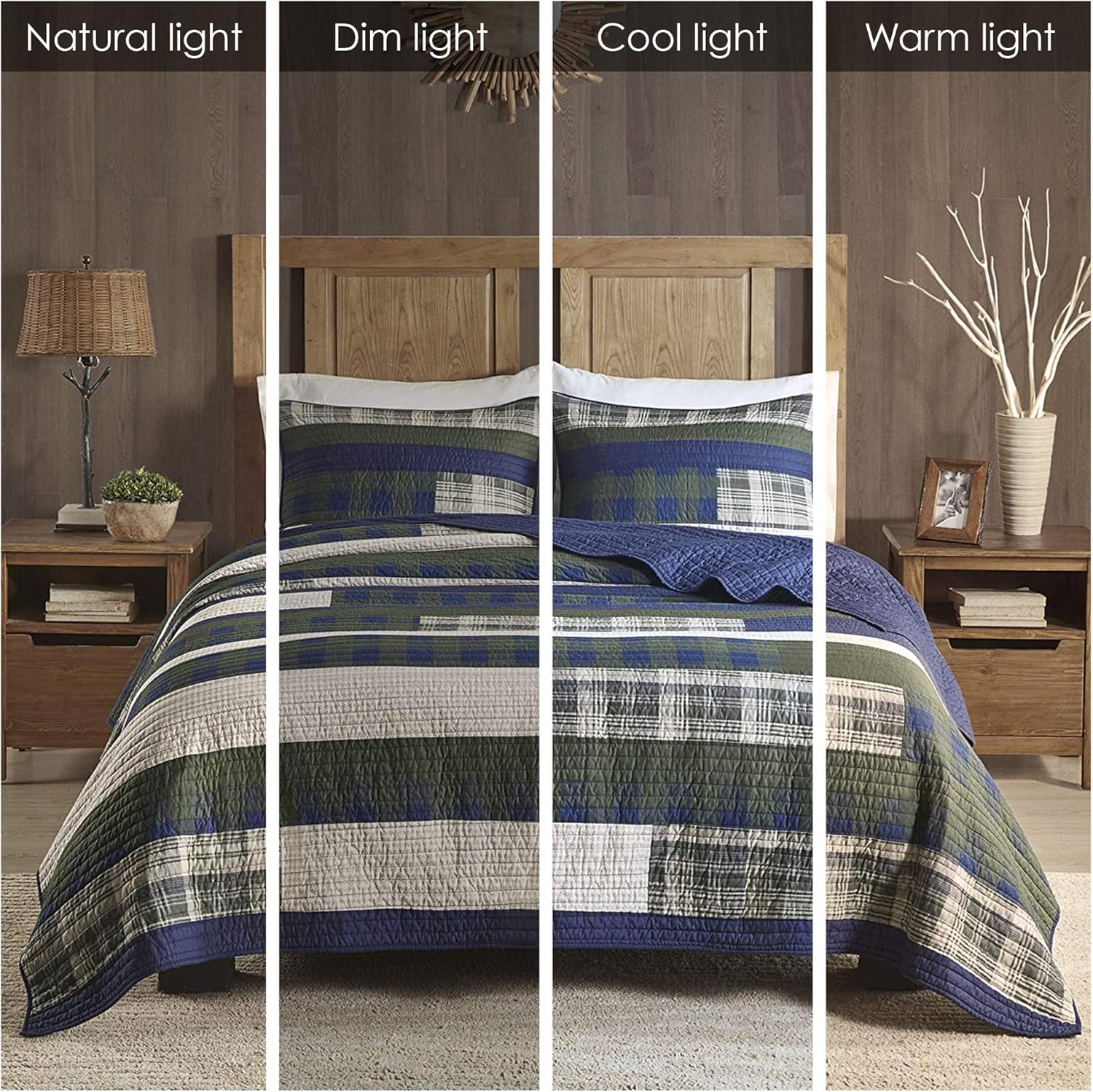 - The 100% cotton quilt features plaid pieced stripes in shades of green and blue and reverses to a solid blue color.