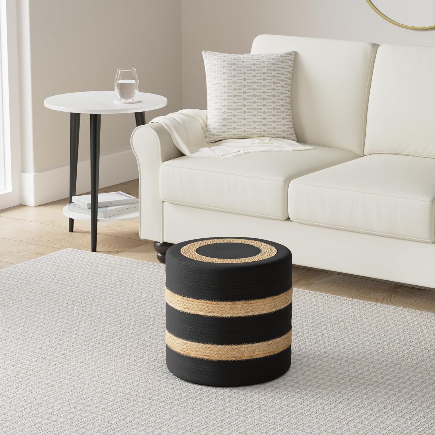REDEARTH · Cylindrical Pouf Foot Stool Ottoman - Jute Braided Pouffe Poof Accent Sitting Footrest for The Living Room, Bedroom, Nursery, Patio, Lounge & Other Rooms (14.5”x14.5”x16”; Black Natural)