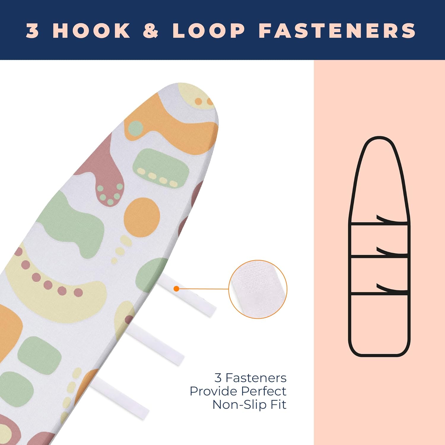 - 3 HOOK AND LOOPS, NOSE POCKET AND ELASTIC EDGES PROVIDE PERFECT NON-SLIP FIT - Elasticized edges, nose pocket and 3 hook and loops design fits the board perfectly. Slipping and the exposure of the edges will be prevented by this. Providing you to have wrinkle free clothes in a shorter time. This ironing board cover and pad is designed for standard size boards (15x54 inches).
