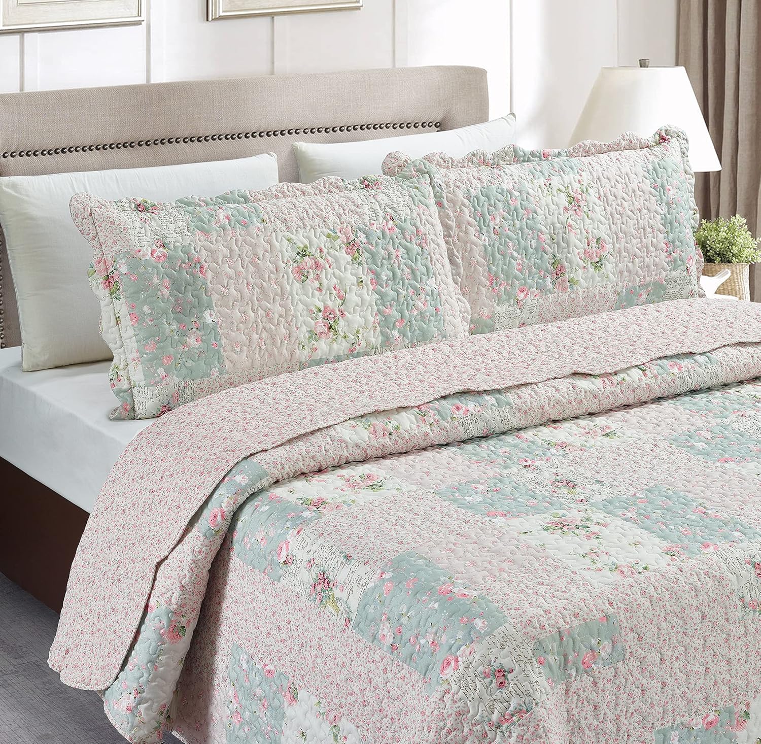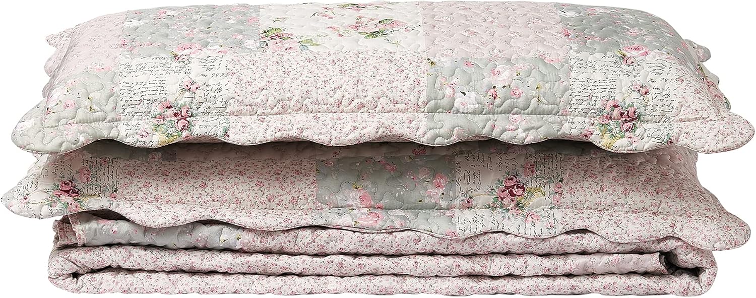 - UNIQUE DESIGN: Traditional printed patchwork design in modern shades of rose and sage, with rose bud patch frames, classic, exquisite and unique. Reverse to a coordinating pattern of rose buds. This quilt set will complete your look.