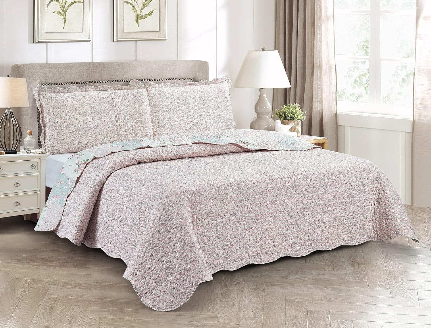 Brilliant Sunshine Rose and Sage Quilt Set, 3-Piece Bedding Sets with 2 King Pillow Shams, Washable and Reversible Bedspread, Soft Lightweight Coverlet, All-Season, King/Cal King, Light Pink Green