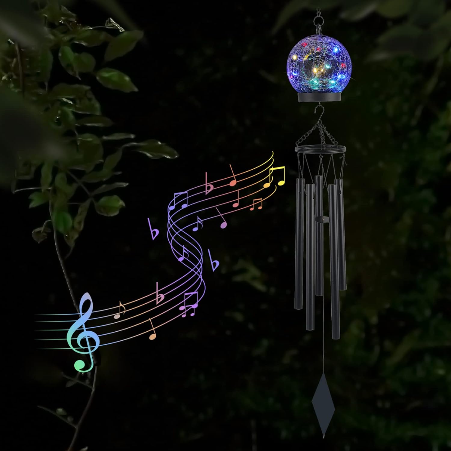 - 【Excellent Design】Elegant wind chimes with crackle glass globes, Each metal tube has sleek clean line. Solar wind chimes will shine in sunlight and twinkle like multi color fairy in night. Creating a happy atmosphere and enjoying the beautiful windchimes in Garden.