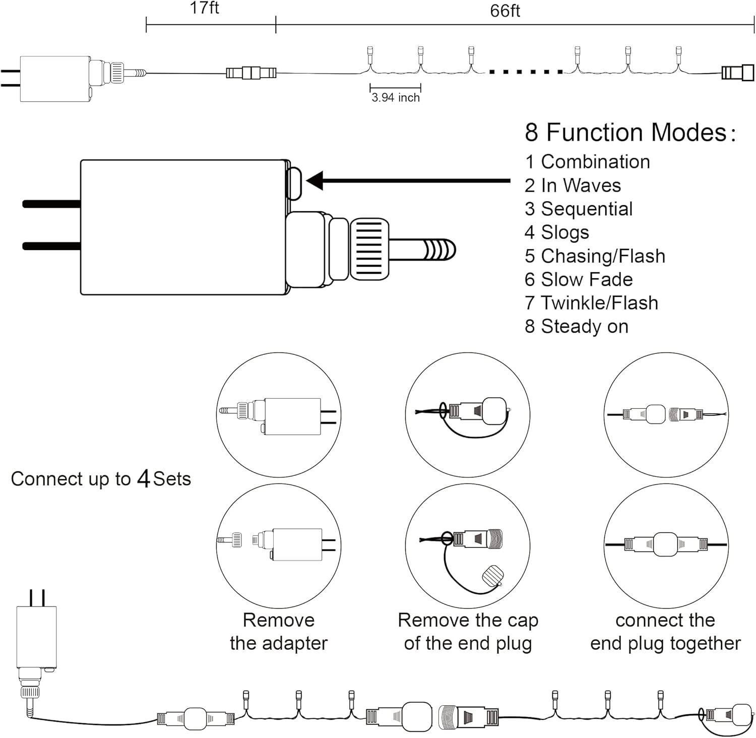 - 8 Lighting Functions with Memory Function: Our fourth July string lights have 8 lighting modes- combination, in waves, sequential, slogs, chasing/flash, slow fade, twinkle/flash, and steady on. Just pressing the round button on the transformer to change the lighting modes. Comes with memory function, will remember last setting automatically after cutting off the power, no need to reset again