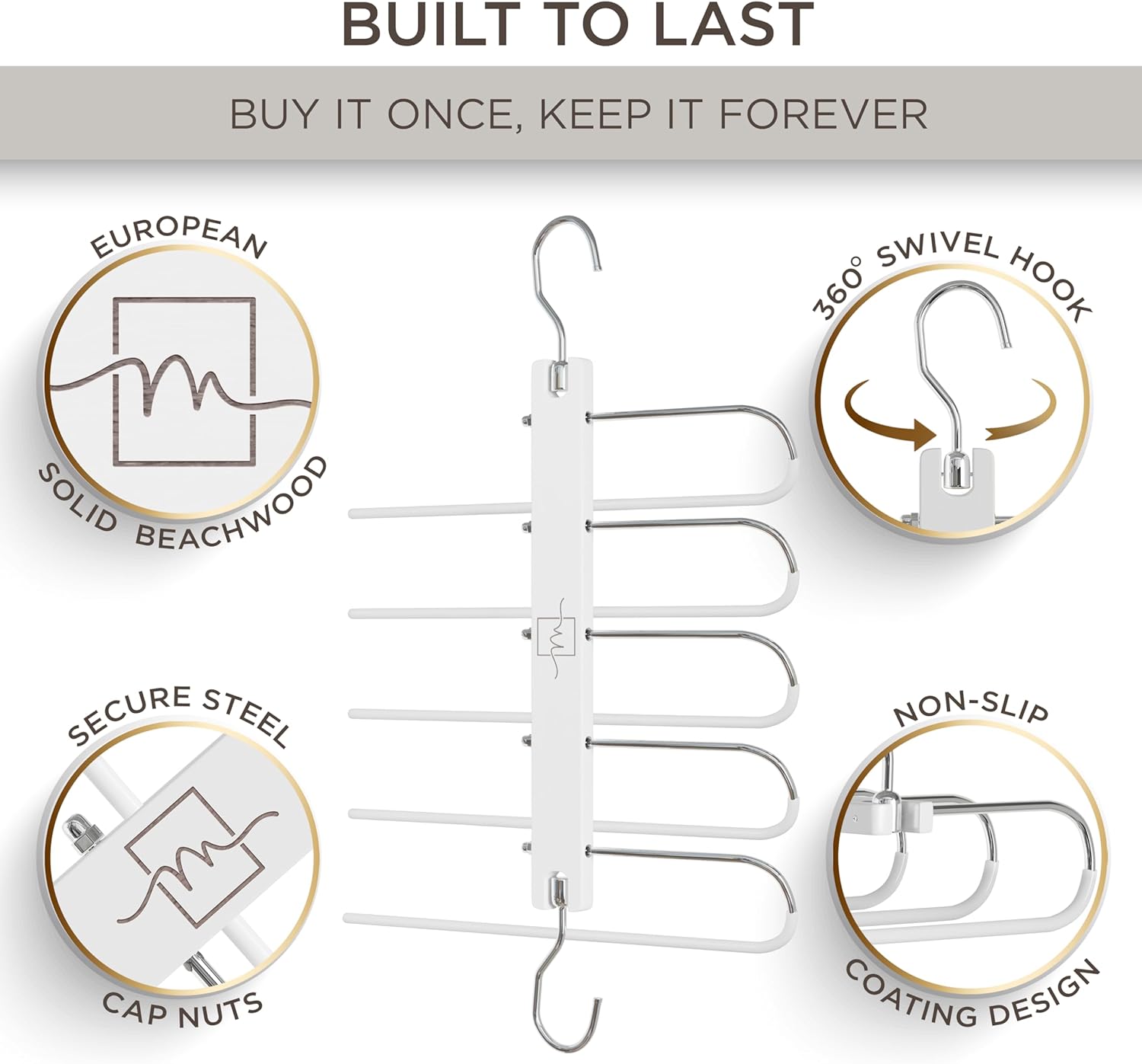 - PREMIUM QUALITY BEECH WOOD - Our beech wood gives you a durable and sturdy clothes hanger organizer built to last. Whether using for light scarf storage or heavy pants our multi functional pants holder will not not bend or collapse thanks to our quality crafted beech wood hanger organizers.