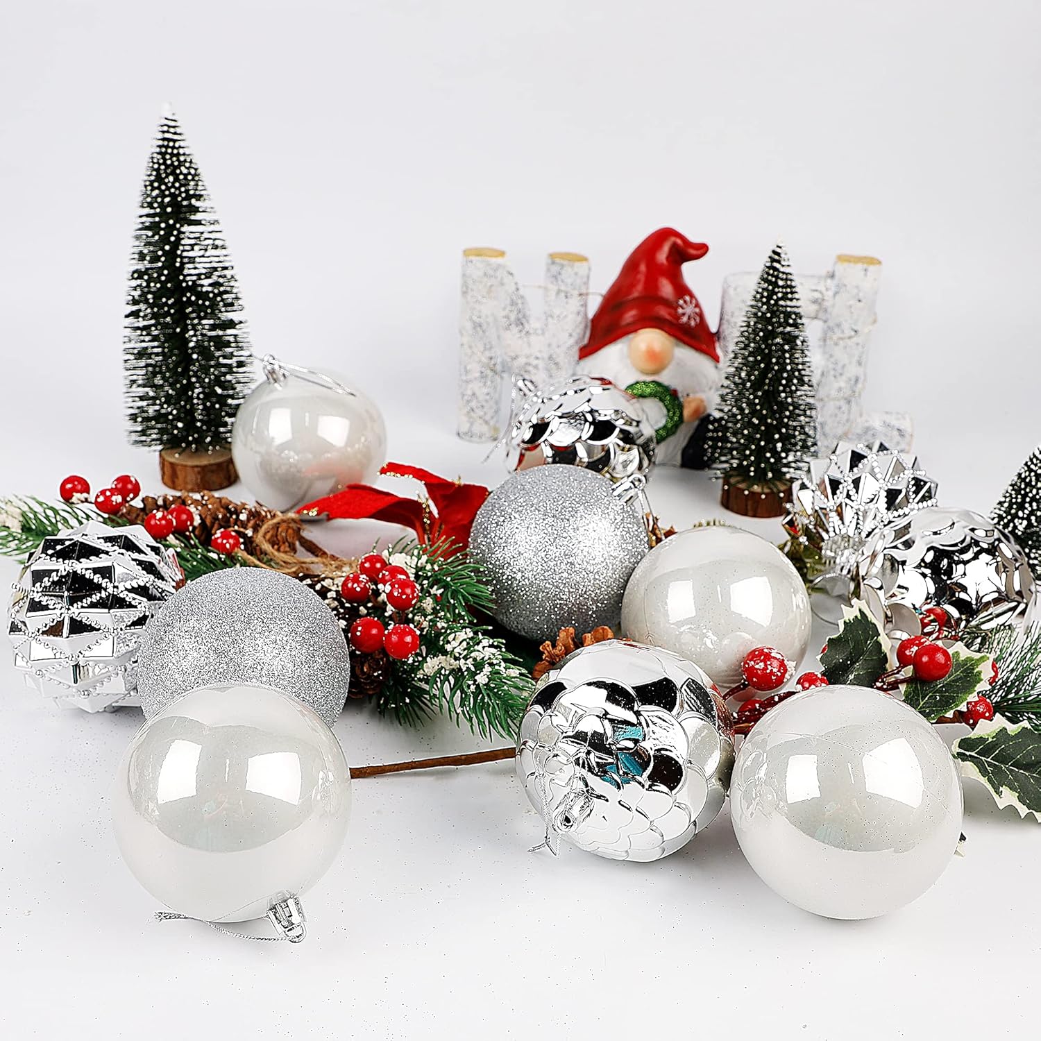 - CHRISTMAS BALLS ASSORTMENT: Sized 3.15" in diameter, Lulu Home silver hanging balls are designed in 4 awesome surfaces – glittered, pineal, polyhedral and unique glass-looking balls. One package includes 20 balls in total, packed in a plastic container.
