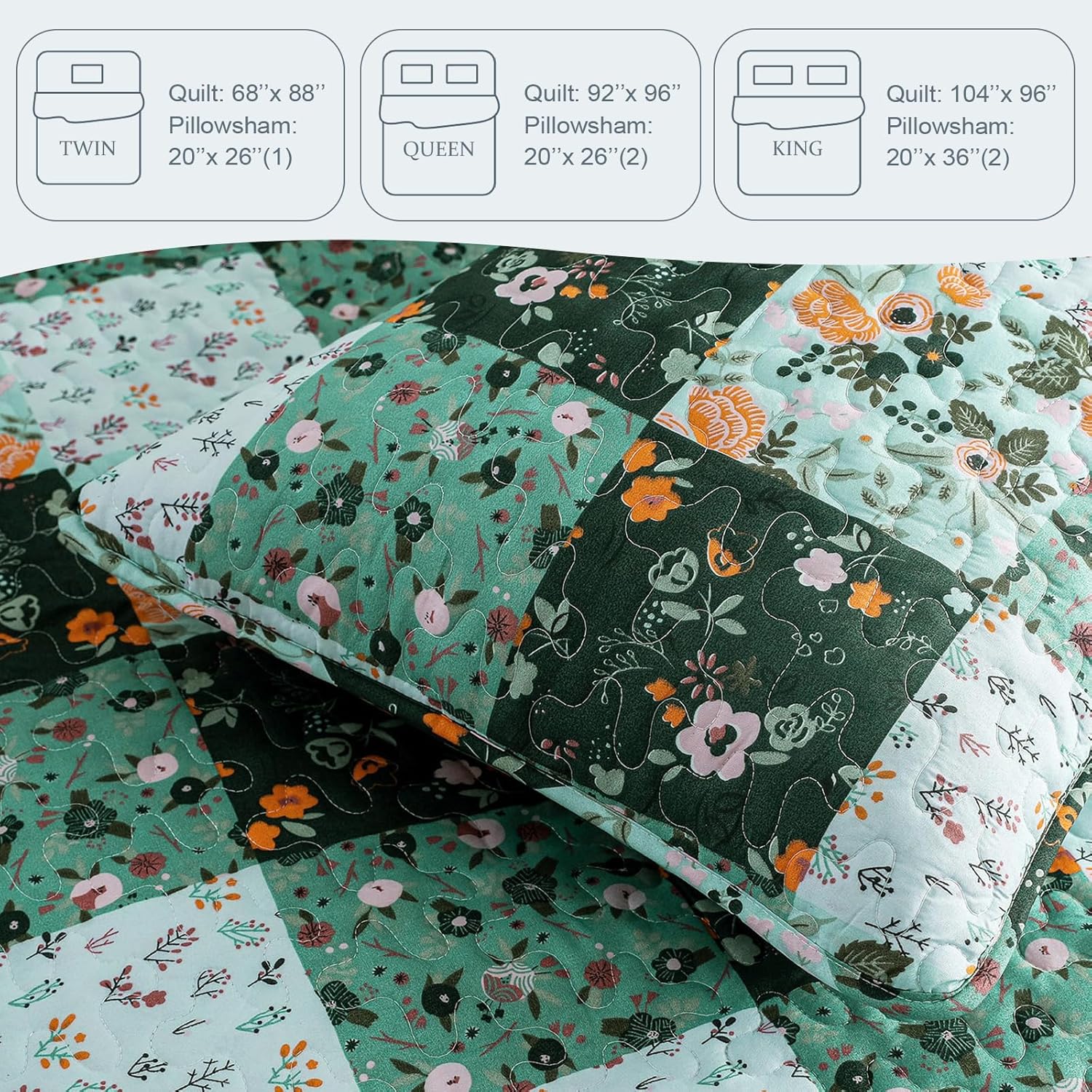 Exclusivo Mezcla Reversible Boho Quilt Set King Size, 3 Pieces Patchwork Green All Season Bedspreads, Ultra Soft Floral Coverlet Bedding Set with Printed Pattern (1 Quilt, 2 Pillow Shams)
