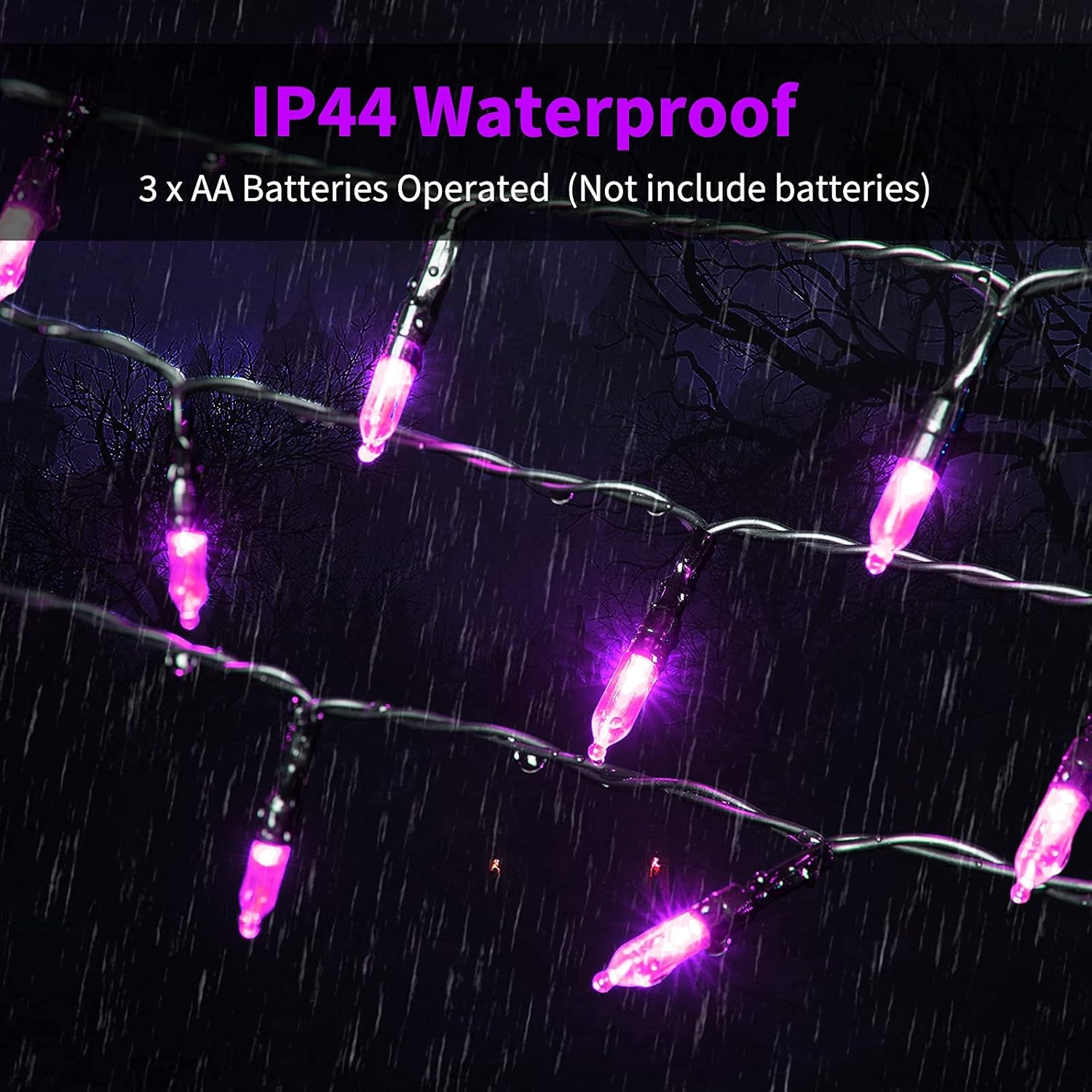 - Battery Operated Halloween Decorations: 3 “AA” batteries (NOT included) operated, 50 LED Halloween decor purple string lights, water-resistant battery case, amazing match for the haunted stuff like the skeleton, ghost, witch hat, and more. Portable for outdoor camping, festival decor