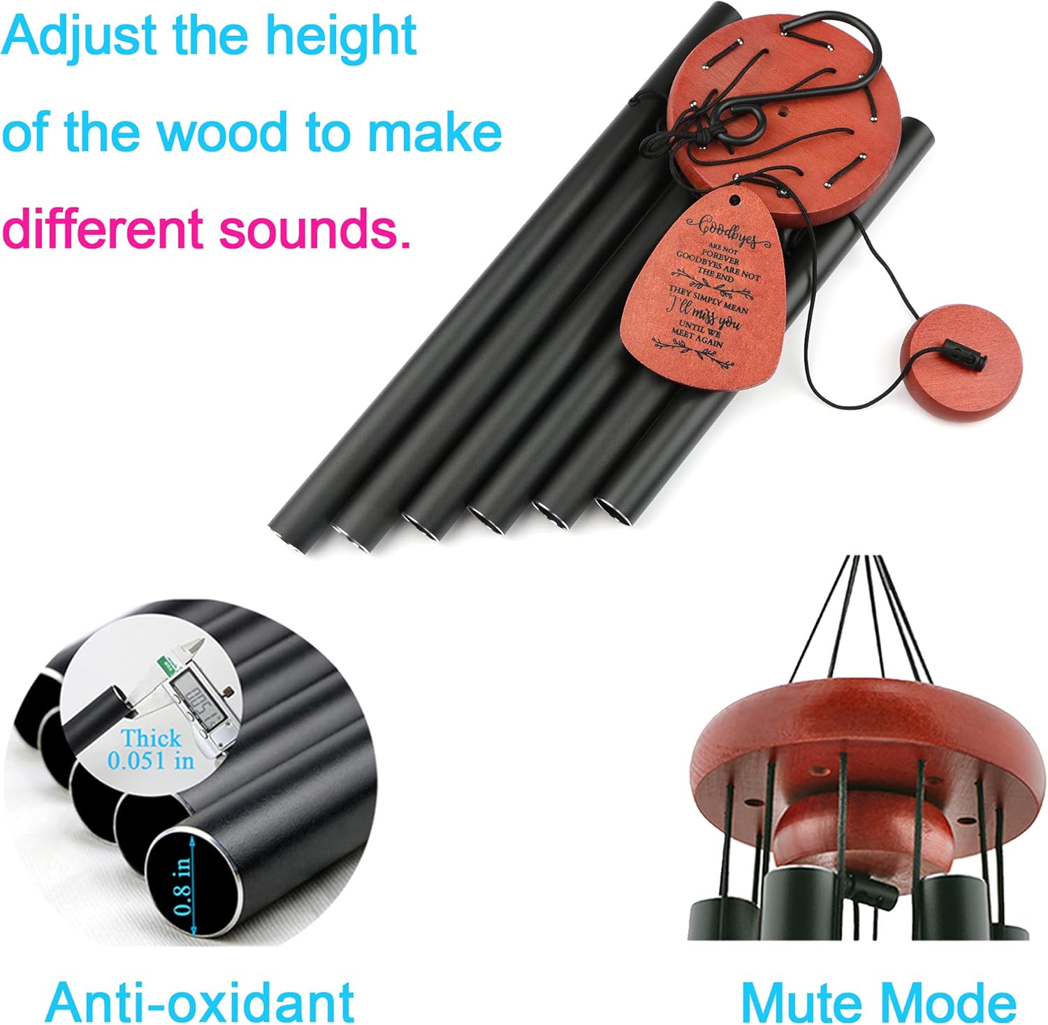 - Premium Quality Memorial Wind Chimes: Made with high-quality aluminum tubes and a corrosion-resistant black anodized finish, these memorial wind chimes produce clear, beautiful tones. The bell holder, striker, and wind catcher are made from durable beech wood, and the entire structure is supported by a strong, weather-resistant nylon cord for lasting outdoor use