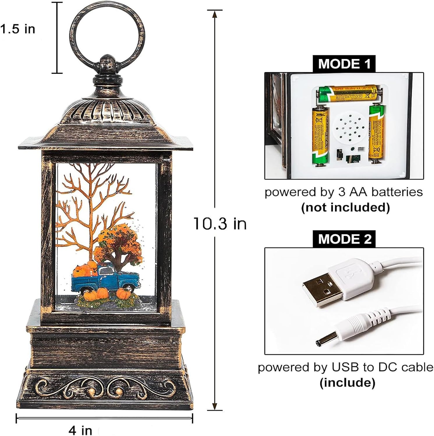 - Two Power Supply Methods: ①powered by USB to DC cable (include), the snow globe lantern can be operated without batteries, which can save you a lot on batteries. ②Powered by 3 AA batteries (not included), you can place it at any place that you want to add warm ambiance.