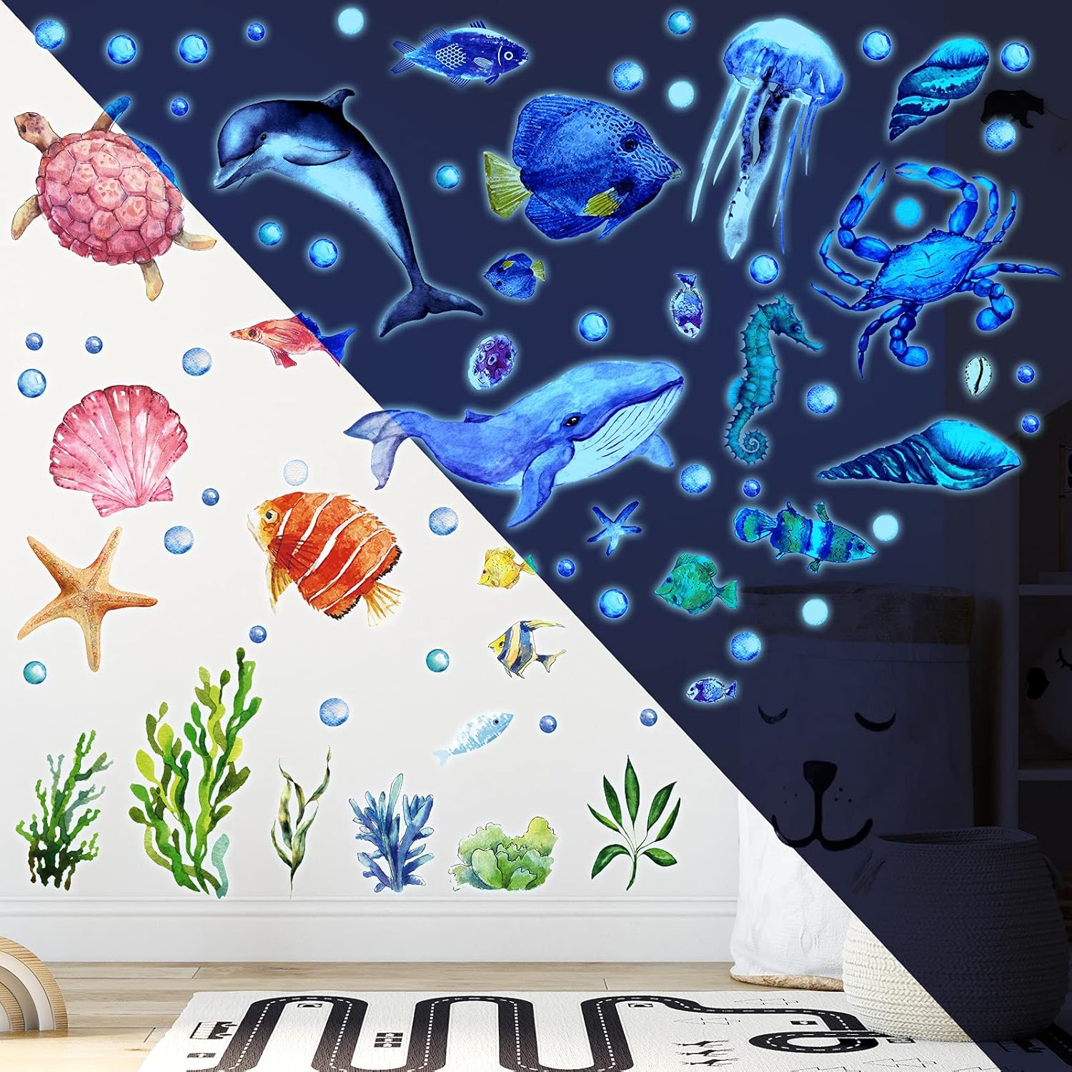 52 Pcs Ocean Fish Wall Decals Glow in The Dark Under The Sea Wall Decals Sea Animals Stickers Removable Waterproof Peel and Stick for Kids Bathroom Watercolor Ocean Decor(Cute Style)