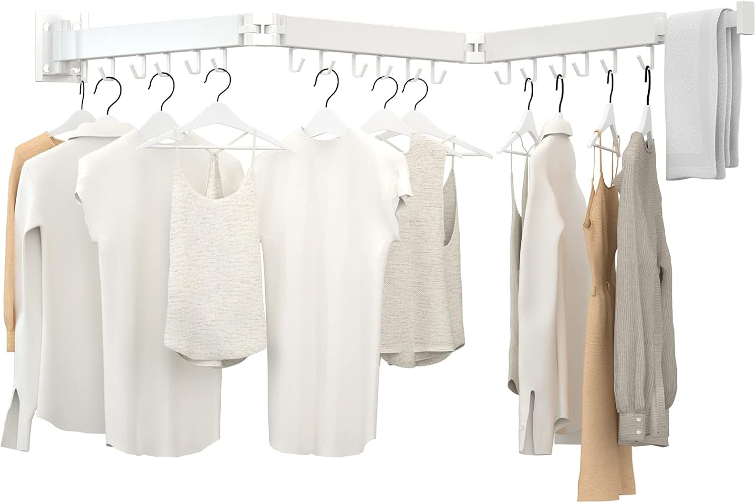- β Flexible & Space Saving Design -- This innovative clothes drying rack wall mounted can swing 180 Β° to the left and right, allowing you to maximize your drying space. Also includes 12 hooks that can rotate 360Β° and a hidden telescopic rod. When not in use, simply fold down to a compact size to keep your area clutter-free