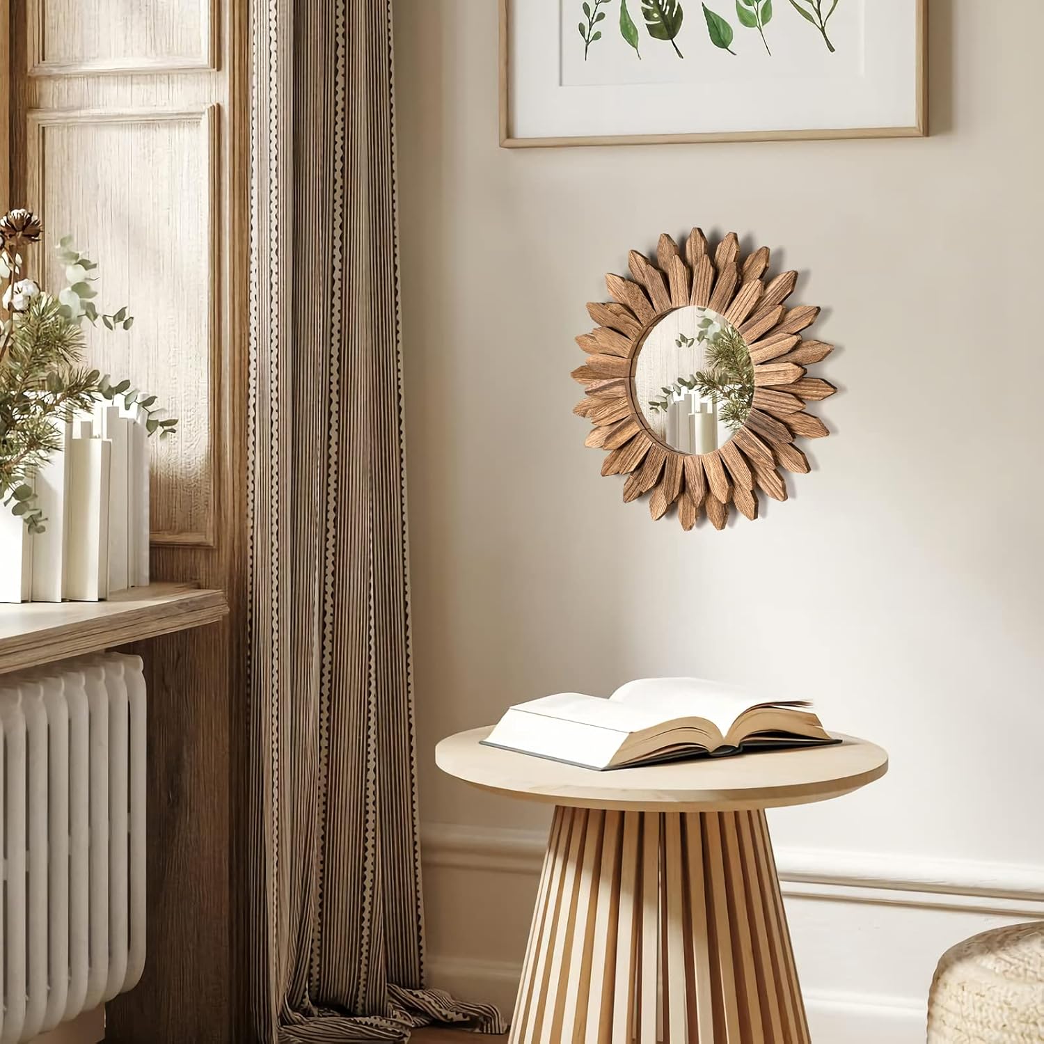 - Boho Wall Decor 12 In Mirror: The design of wood sunburst base on the element of boho style, it will be a nice boho wall art and goes well with your boho decor, farmhouse decor country rustic decor,modern deocr style; A perfect room decorations for your bedroom, living room, bathroom, kitchen, fireplace, entryway, home office, school, new partment, guest room of hotel