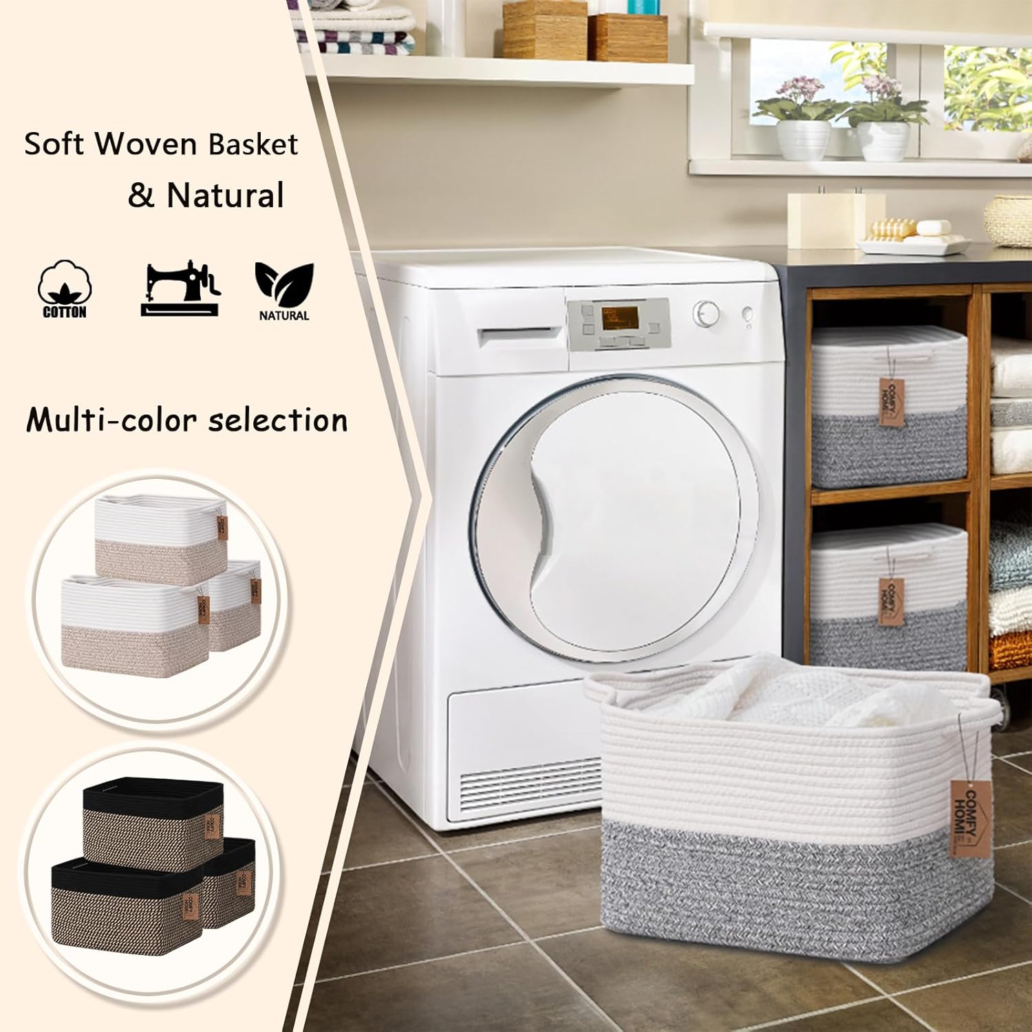 COMFY-HOMI Cotton Rope Woven Basket with Handles for Shelves,Toys,Book, Cloth Storage Baskets Bin for Organizing-13.5"x11"x9.5" Toy Decorative Organizer for Living Room, Bathroom-White/Grey