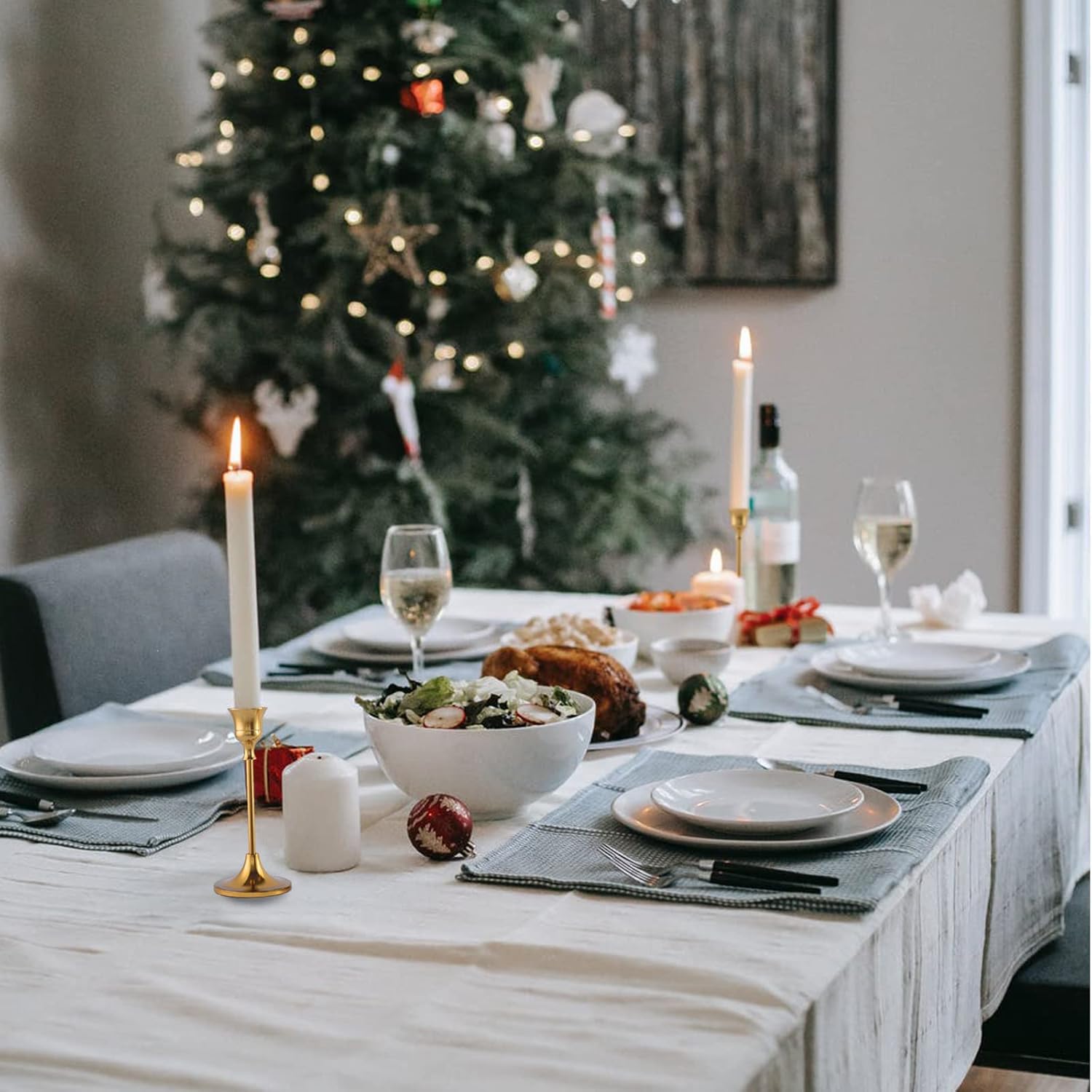 - 👍【Sturdy and Stable Brass candlestick holders】Made with sturdy, durable metal,this candlestick holder is durable and sturdy enough to hold tall taper candles. Each Gold candlestick holder set can fit 3/4 inch and 7/8 inch small pillar candles as well as LED cone candles to match your dining table decor.It provides a stable base for your candles,ensures stability and longevity for your candles.
