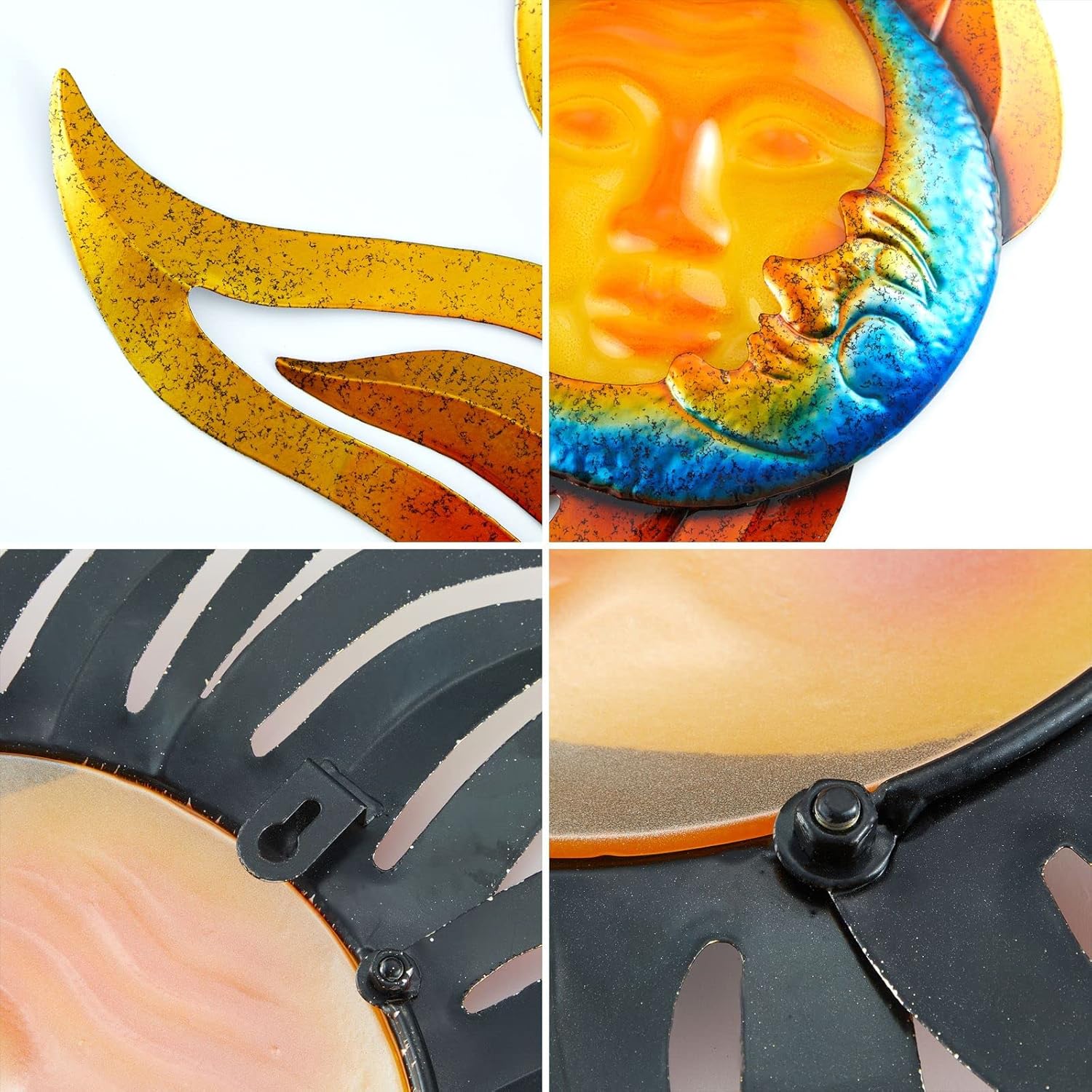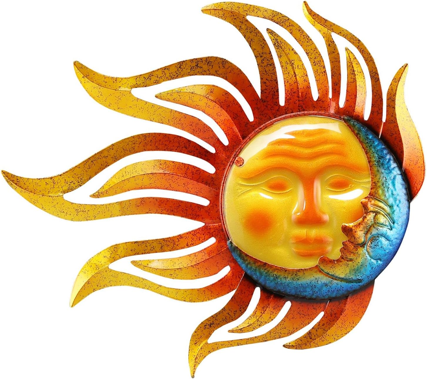 - The sun and moon outdoor wall decoration is made of metal and glass, which is durable. The shape of sunshine and smiling face brings happiness to your family members & friends.
