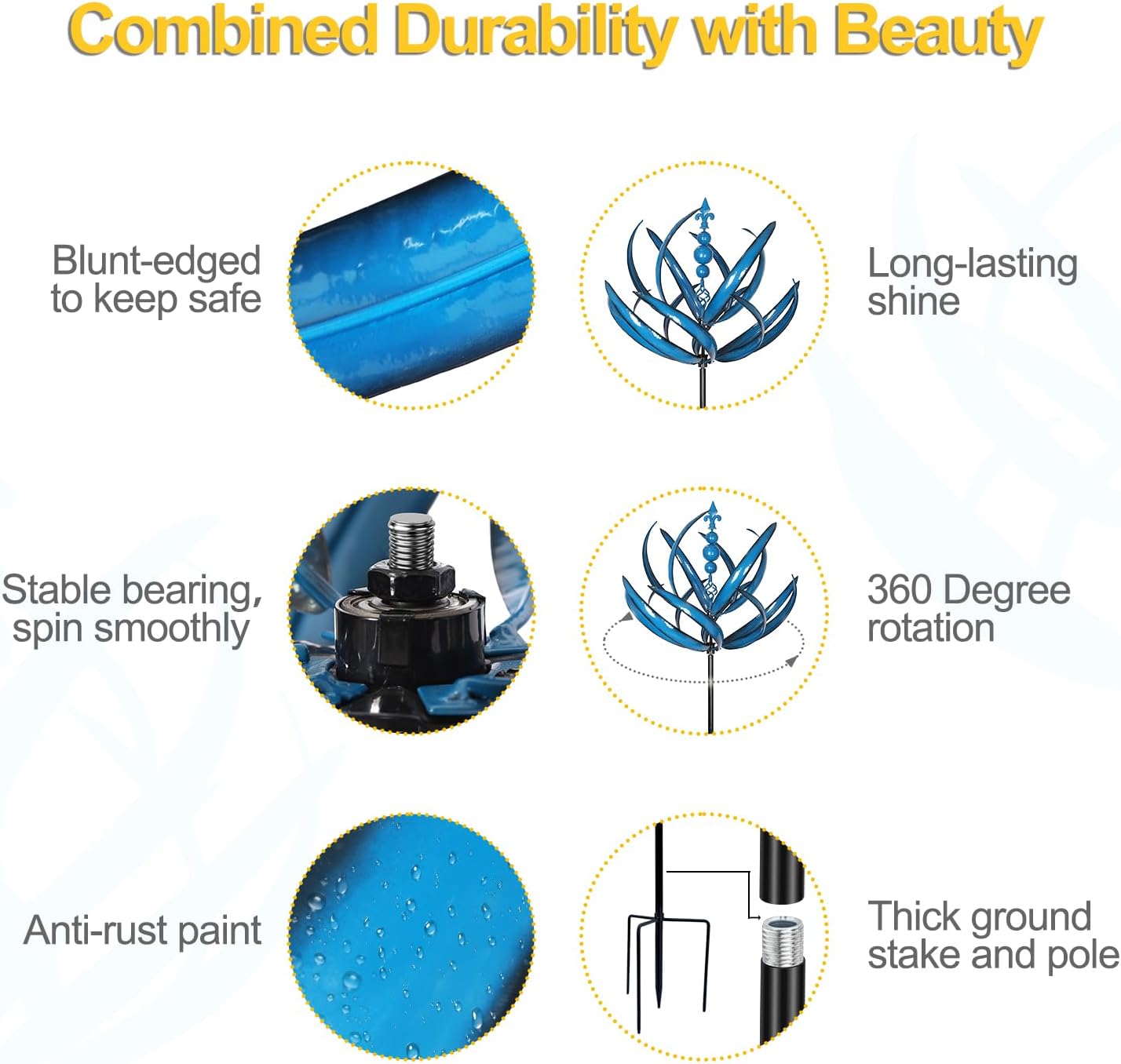 - 【Withstand All Weather】Stable pronged base stake design to keep the outdoor large wind spinner balanced and firmly placed. Hand-painted and UV treated to resist fading, so it is long-lasting and will perfom well as a garden decoration.