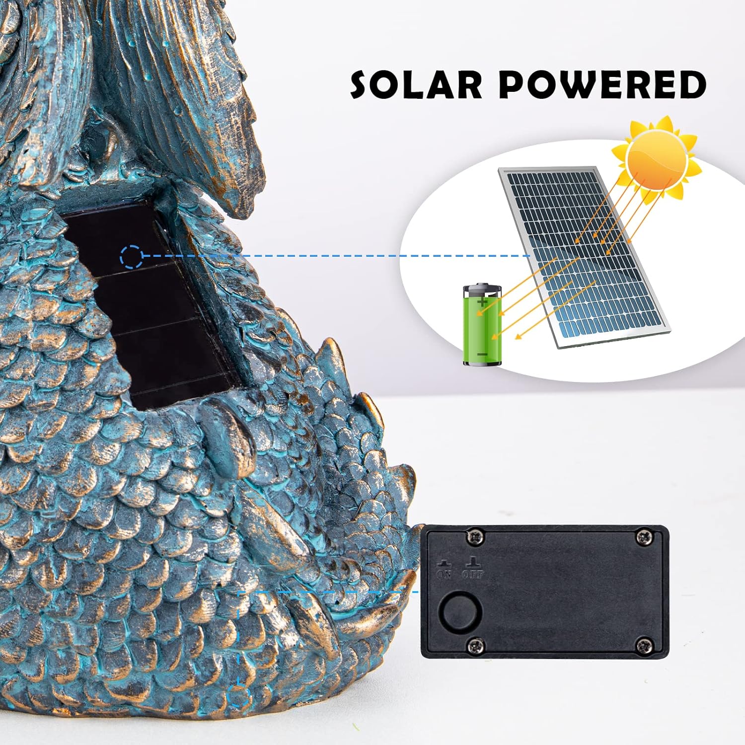 - Exquisite Details: Garden statues and figurines made of resin material with hand carved. Dragon statue has waterproof solar panels, suitable for all weather conditions