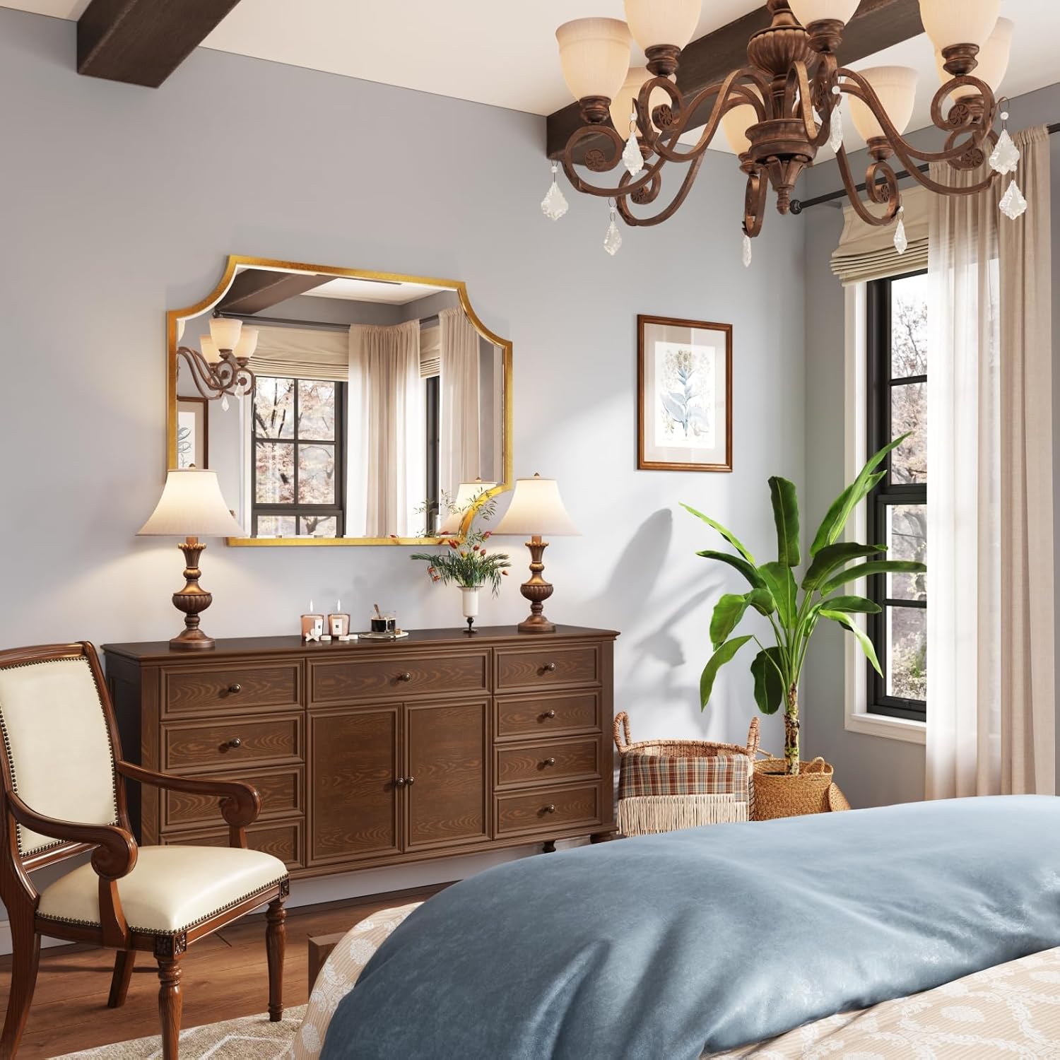 - SOPHISTICATED DESIGN: The mirror frame features an elegant scalloped corner shape. It's a traditional mirror style, but it also gives the mirror a simple and modern look, and it can be placed over a cabinet or fireplace or hung in your bathroom, living room, dinning room, or kitchen.