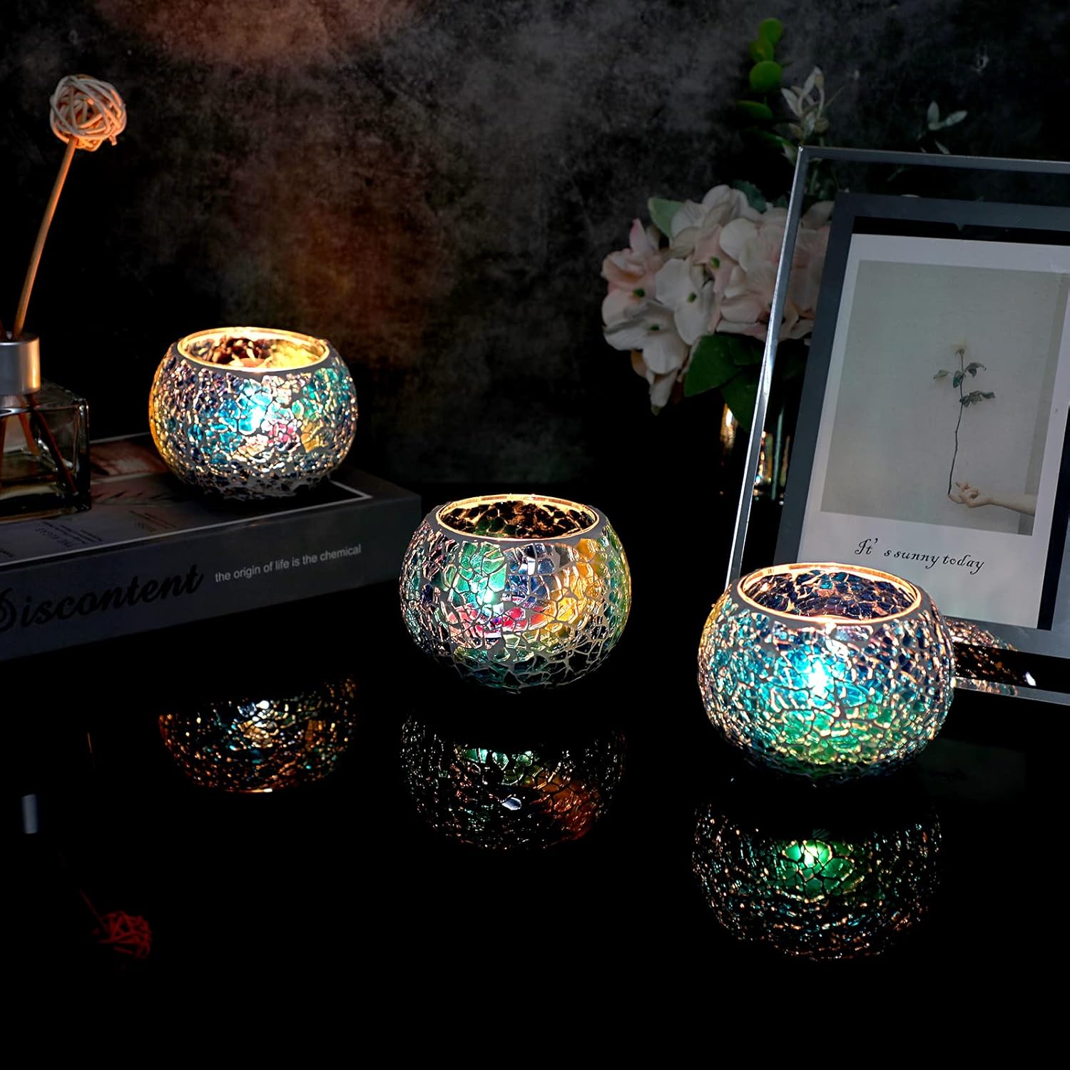 - Made of high quality solid glass pasted with small colored mosaic glass shards, this set of mosaic votive candle holder looks sparkly and beautiful, providing long durability and strong water & dust resistance.