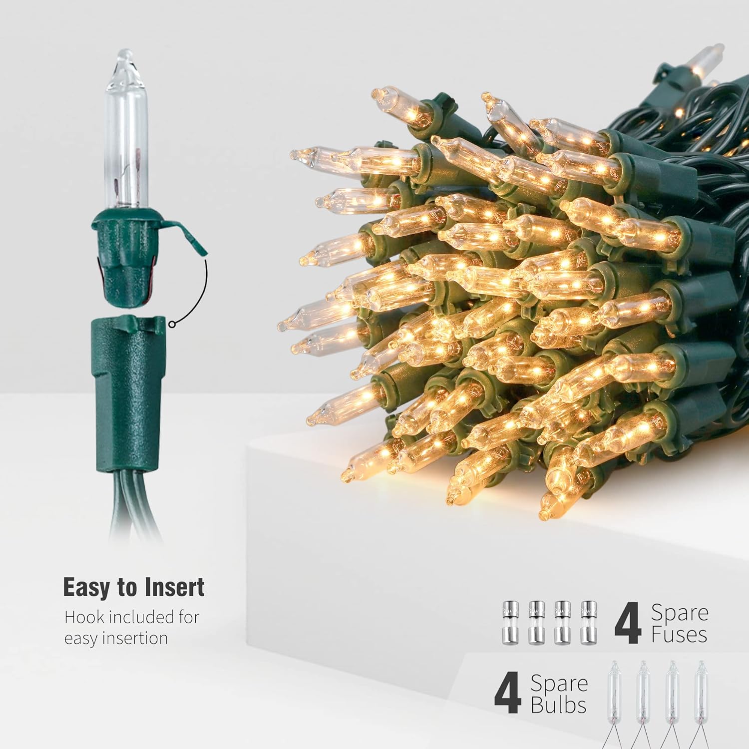 - Steady-lit on with Safety:Our lighting sets can still stay lit when a bulb was removed,loose or missing,and easy to fix and replace with spare extra bulbs and fuse when one of bulb burn out or break.Thicker green wire with strong insulated copper core, tangle-free to use,High quality UL certified products ensure the safety of you and your family.