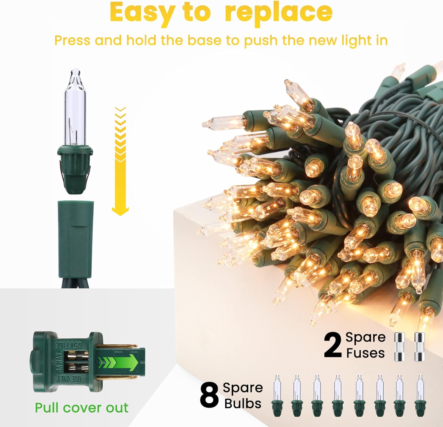 - š Specification & Quality Customer Service: 300 count mini bulbs, 75ft long green wire, the length between 2 bulbs: 3inch. Come with 8 spare bulbs and 2 spare fuses. Toodour provides 30-day money-back and 12-month replacements. If you have any questions, please feel free to contact us.
