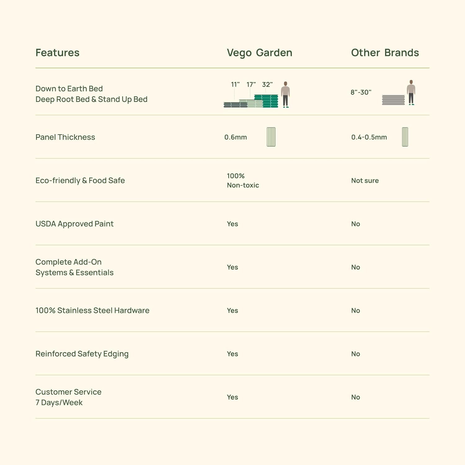- Complete System: Vego Garden has aimed to create unified gardening systems that start outside, in your garden, and extend all the way into your day-to-day today life. The team continues to develop more products that enhance the Vego experience, such as cover system, worm composters, arched trellis and wall trellis and so on. Beyond the physical product, education and community are an integral part of the Vego Garden system, we will continue to strive for these values from design to customer