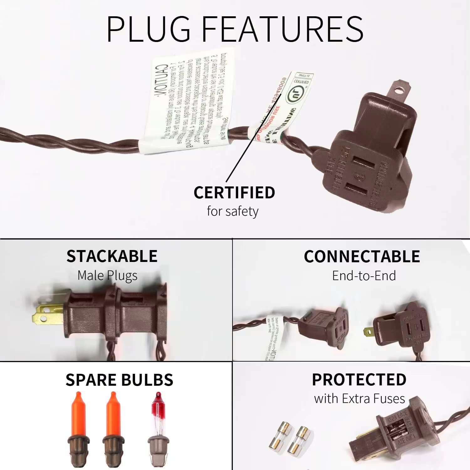 - Product Nature:Each mini halloween light set comes with end-to-end plug, can be connectable up to 5 sets (500 lights). Each bulb space 2.5in, 2.5V and 0.425W per bulbs, built-in 3A fuse for safe use. Extra bulbs and fuses are included.