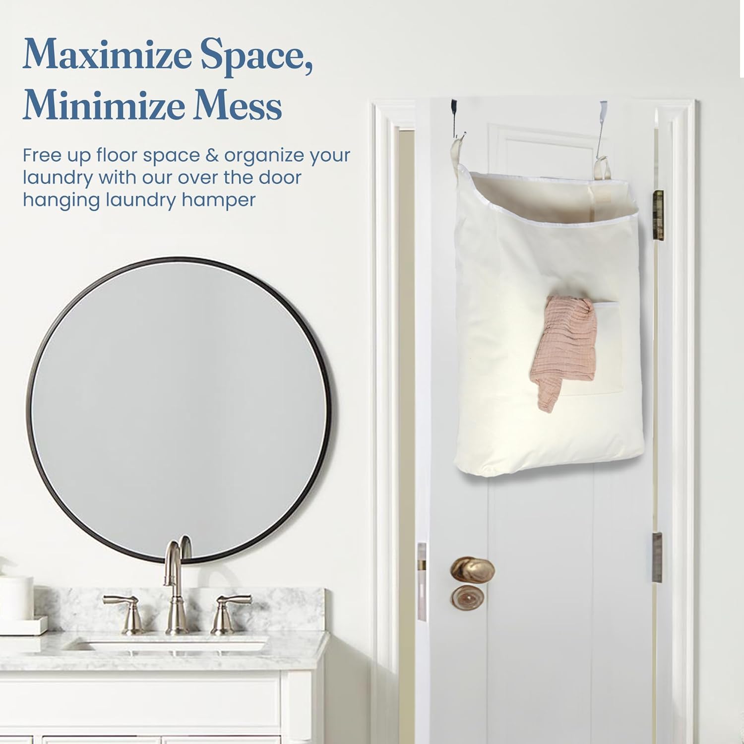 The Fine Living Co. Hanging Laundry Hamper with Over Door Hooks & Adhesive, Durable Space Saving Laundry Bag with Zipper and Wide Open Top, Hanging Dorm Laundry Hamper 18"x4.75"x28" (Beige-L)