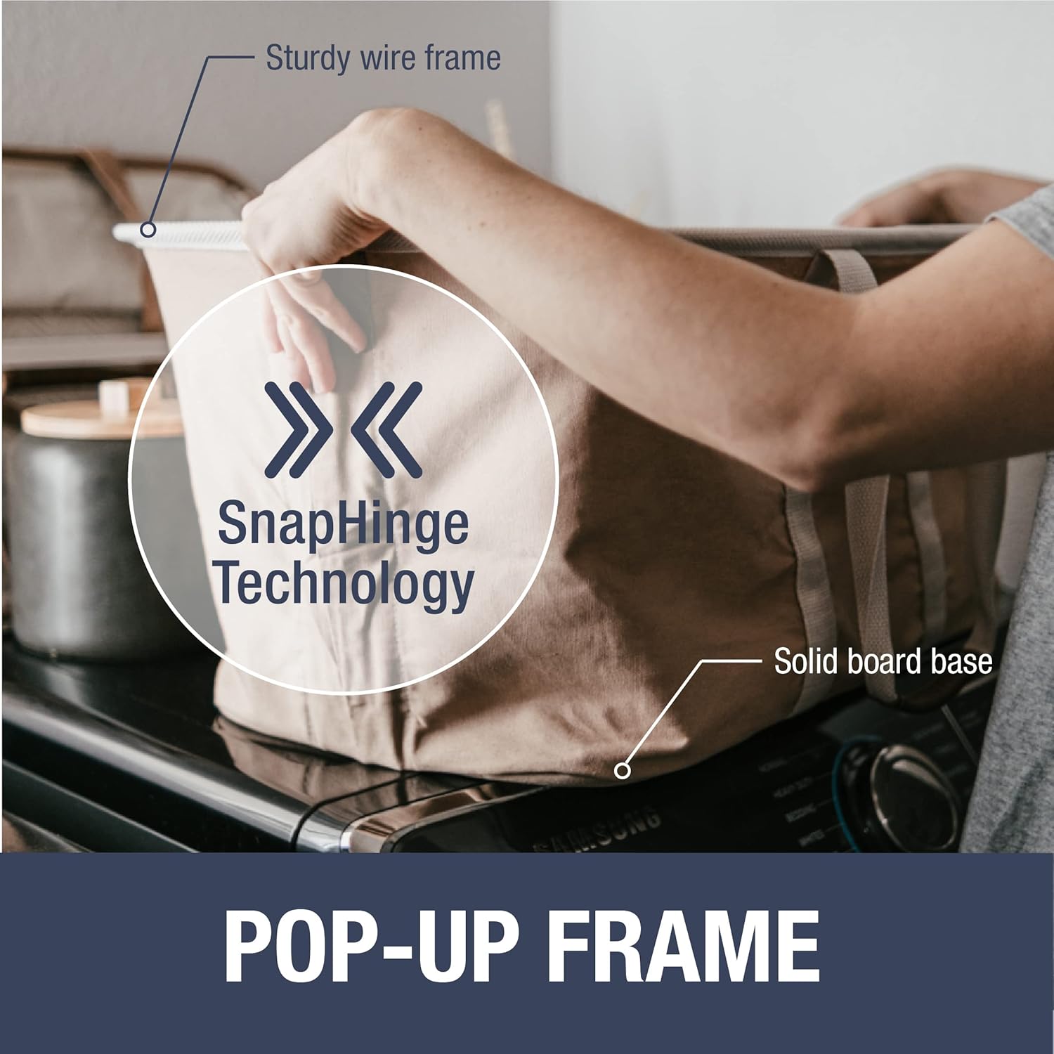 - Reinforced Steel Rim and Wooden Base: Engineered with SnapHinge technology, this fabric laundry basket features a solid board base and a durable rim for a lightweight and sturdy structure that snaps open for use or folds flat for storage