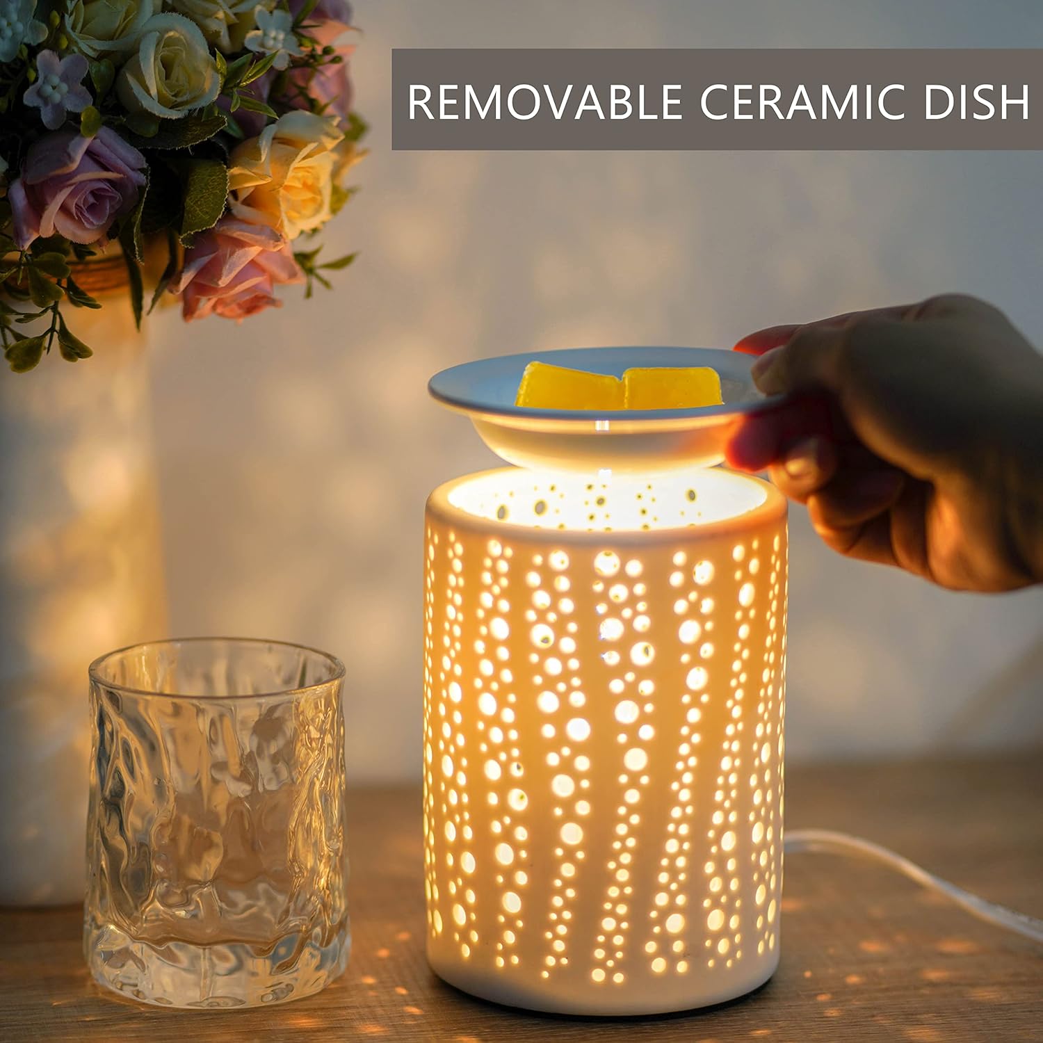 - 【2/4/8 Hr Timed Off】Classic hollow-out and modern integral pattern design. Durable ceramic material. Embedded with timer switch, you can choose either continuously heating or timed off heating for 2/4/8 Hrs. No worries about forgetting to turn off the warmer.